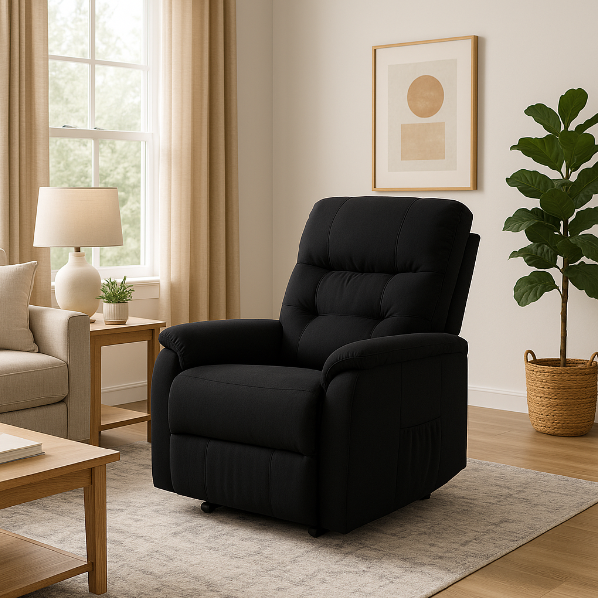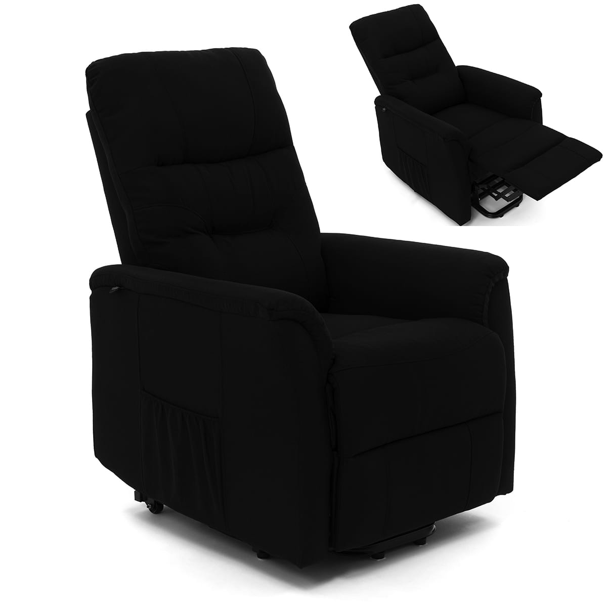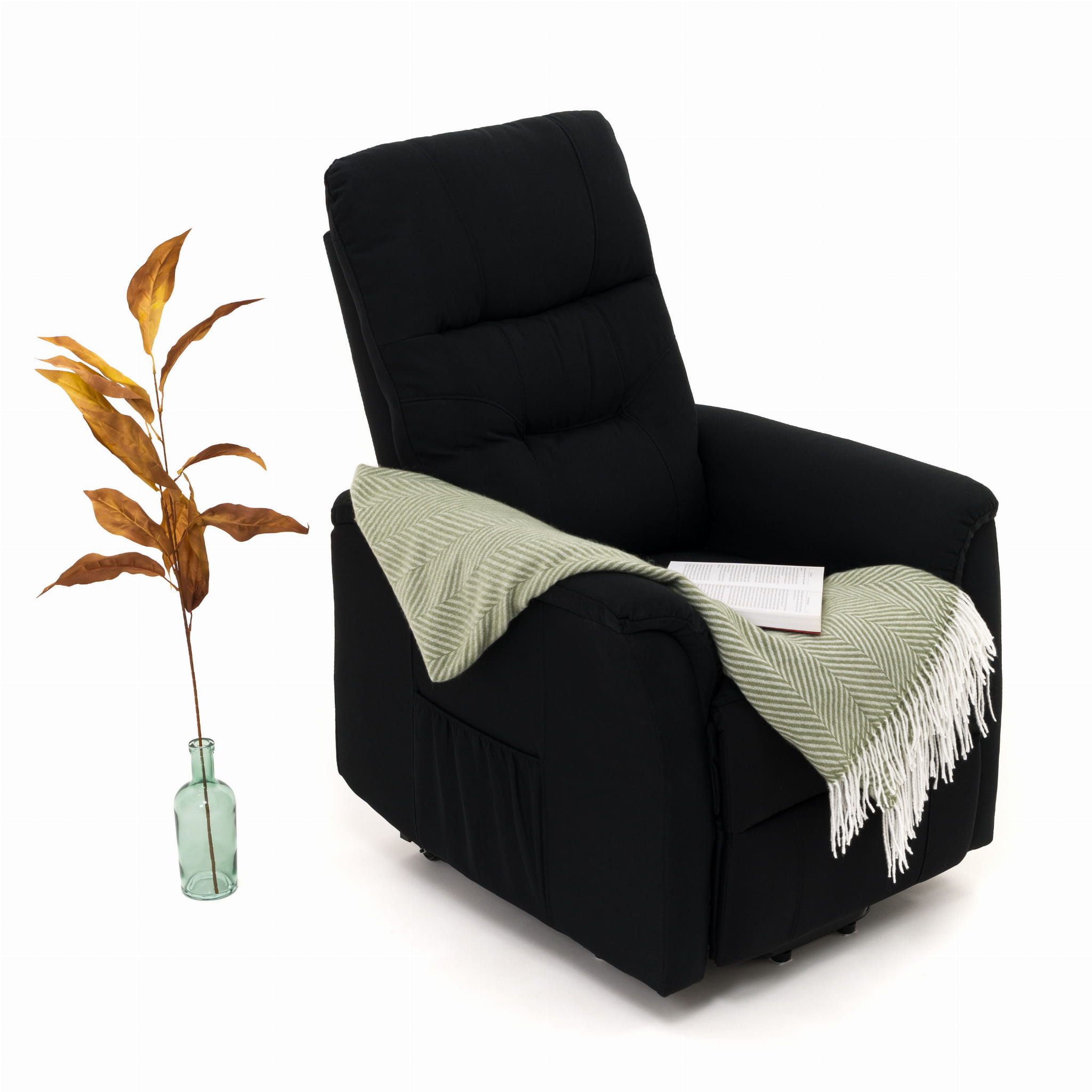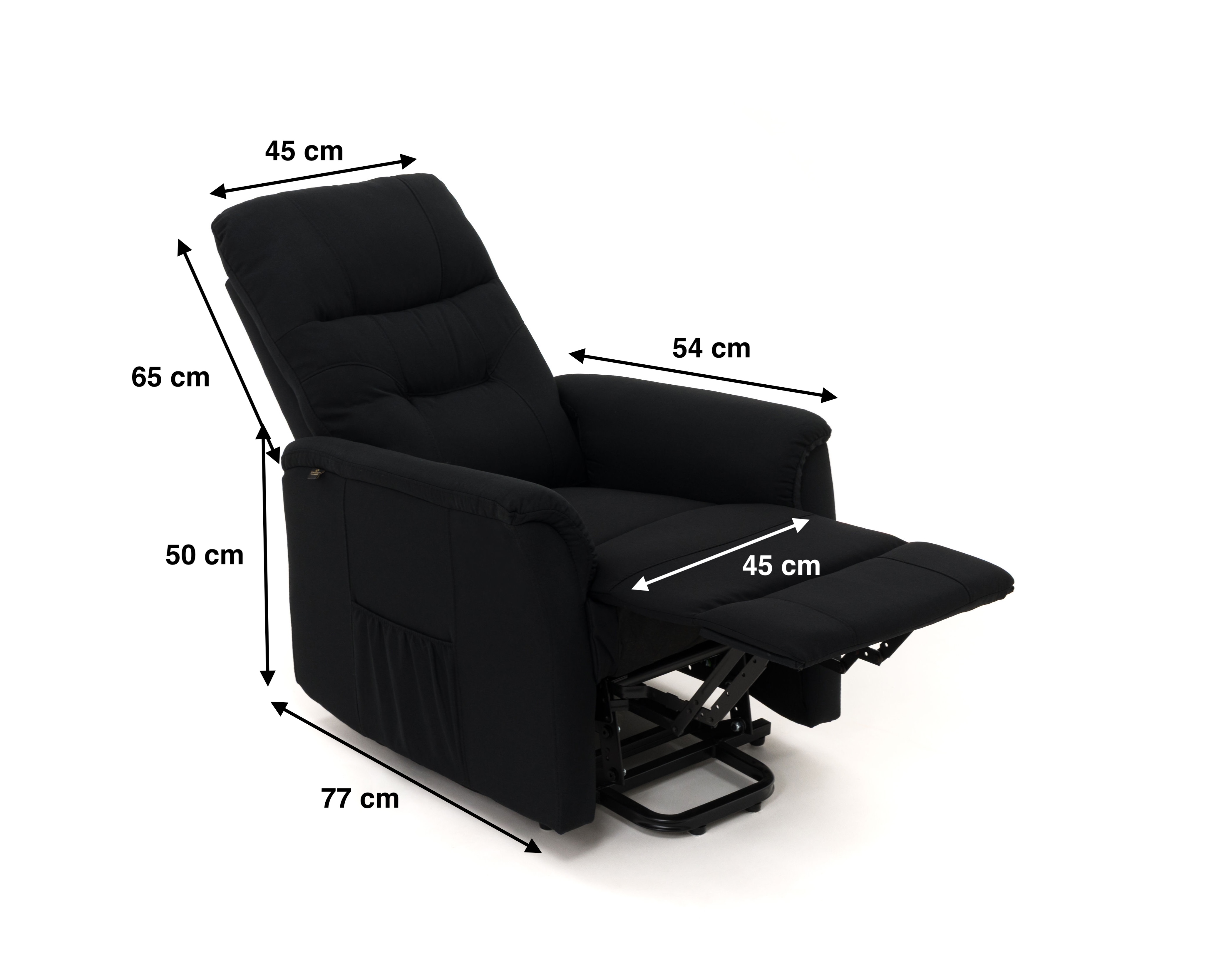 Obicie z eleganckiej tkaniny strukturalnej nadaje mu nowoczesny wygląd, a jednocześnie jest przyjemne w dotyku i łatwe w czyszczeniu. Boczne kieszenie umożliwiają przechowywanie drobiazgów – takich jak gazety, książki czy pilot – zawsze pod ręką. Dzięki temu fotel łączy w sobie komfort wypoczynku i praktyczne rozwiązania na co dzień.