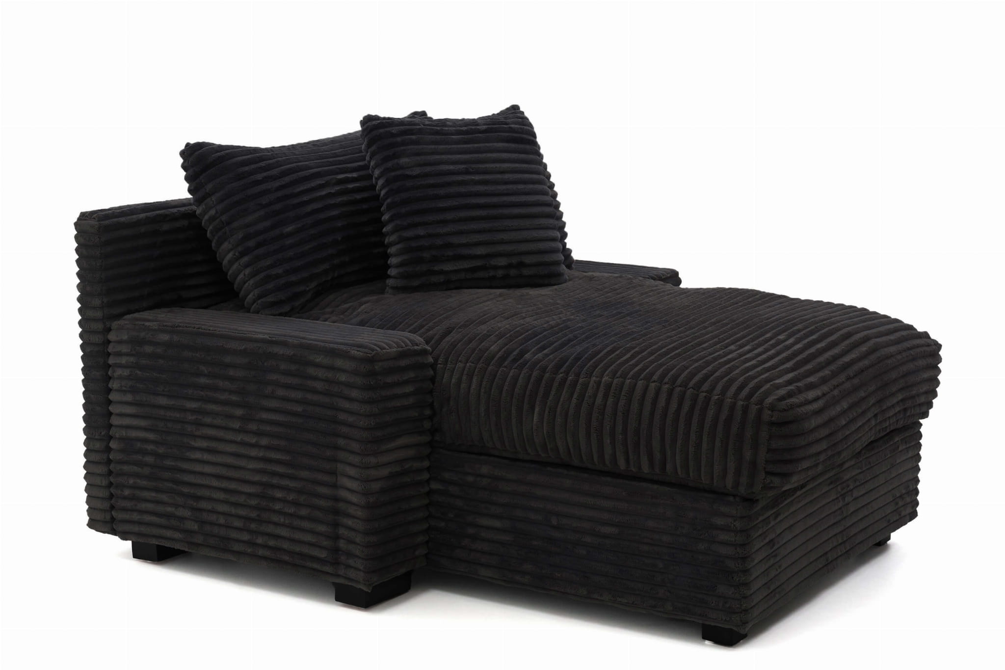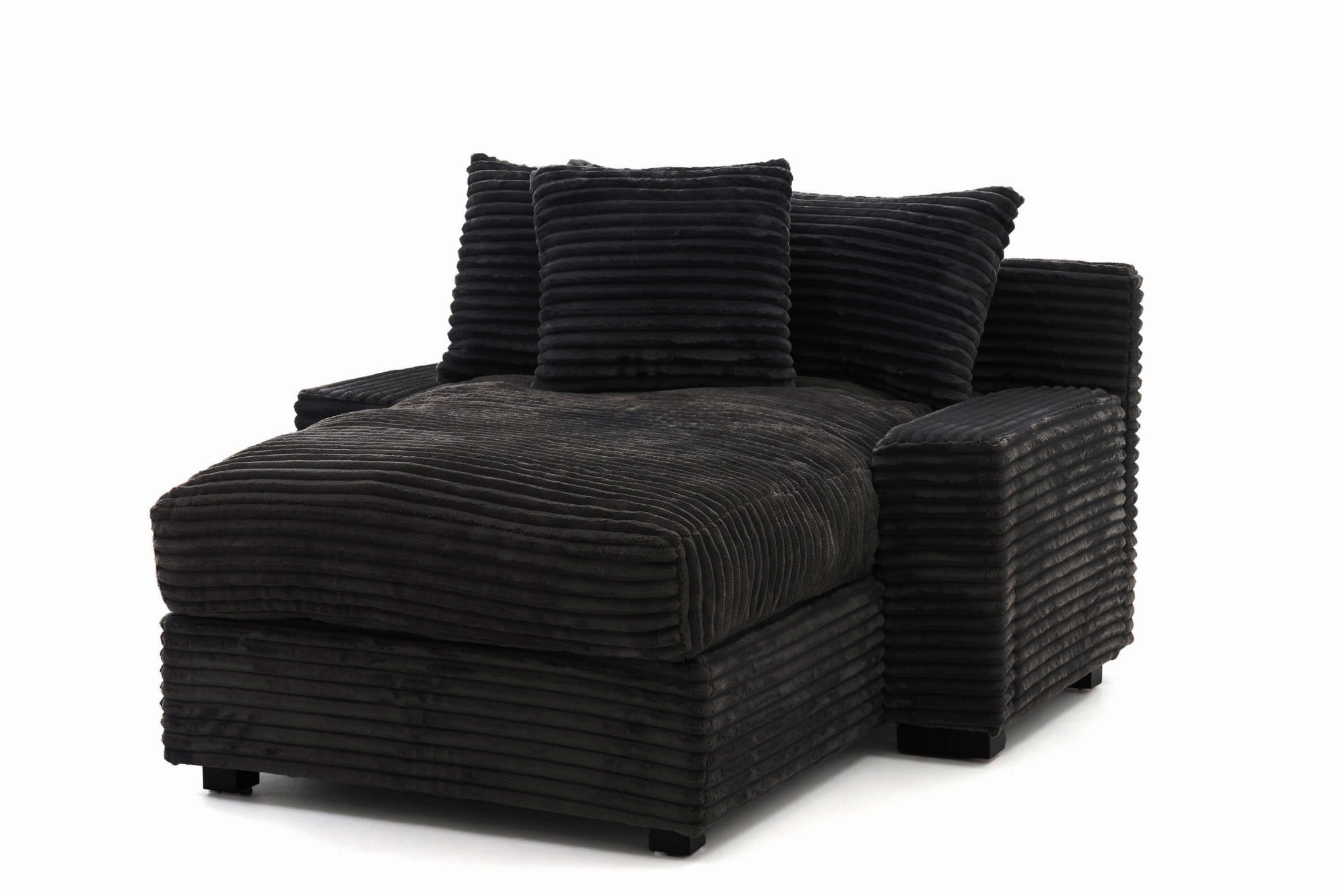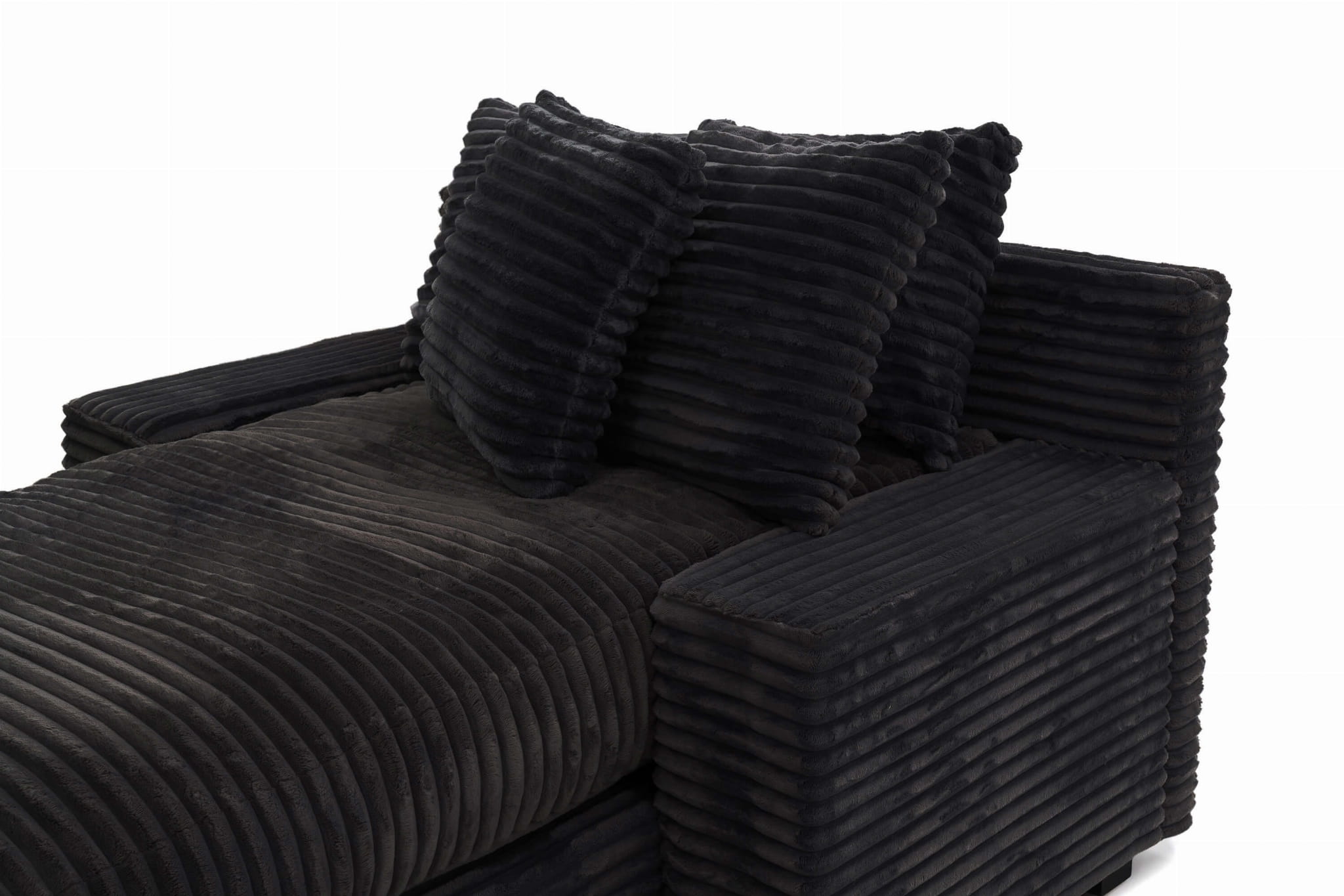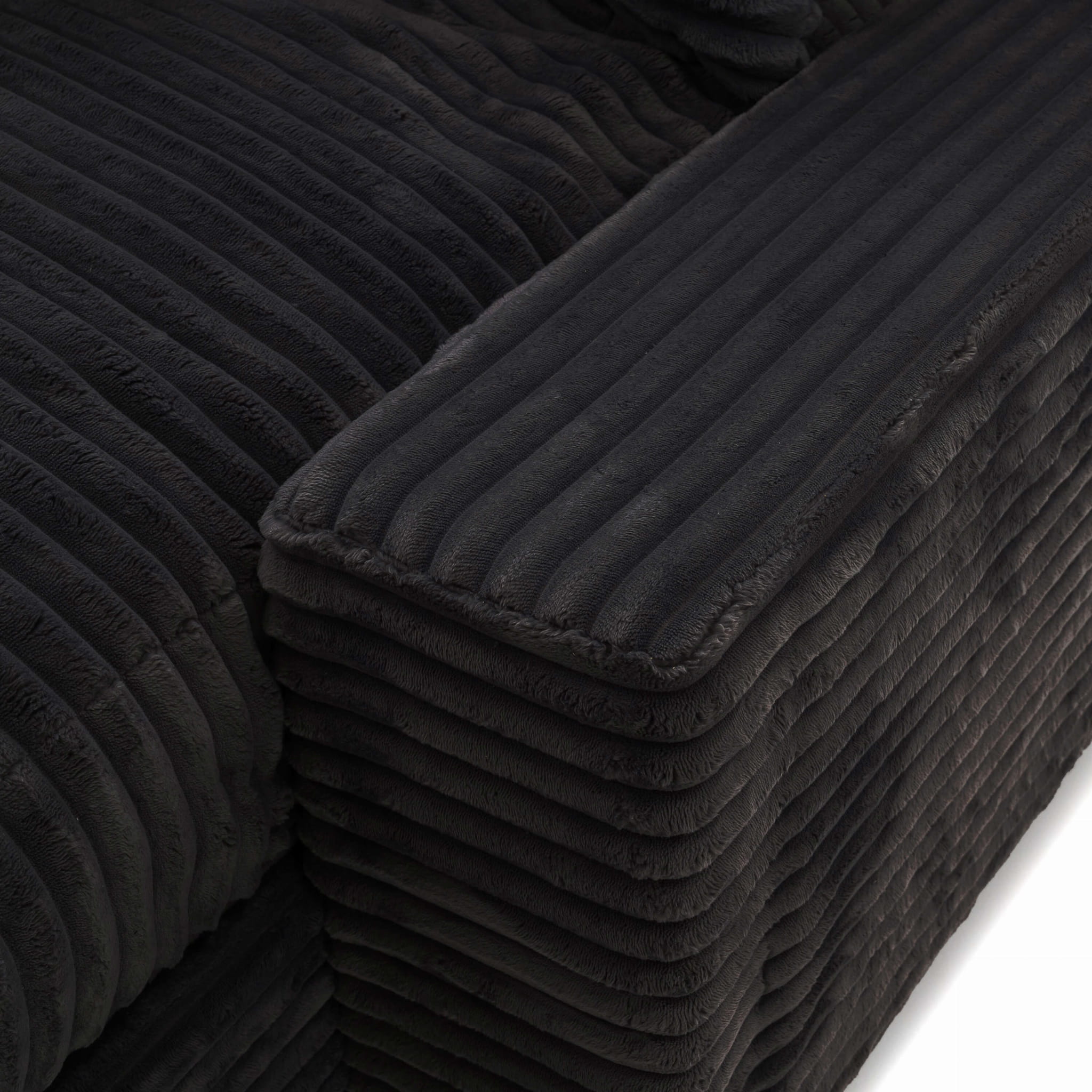 Geometryczna forma i wyraziste poziome przeszycia nadają Austinowi charakteru nowoczesnego, „miękkiego” loftu – wygląda jak mebel z designerskiego apartamentu, ale bez zadęcia: jest po prostu wygodny, przytulny i bardzo „domowy”. Czarna sztruksowa tapicerka pięknie łapie światło, podkreślając strukturę prążków, a przy tym jest przyjemna w dotyku i sprzyja długiemu leniuchowaniu.