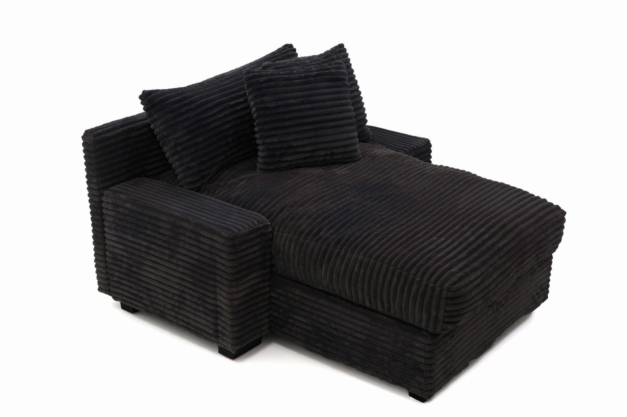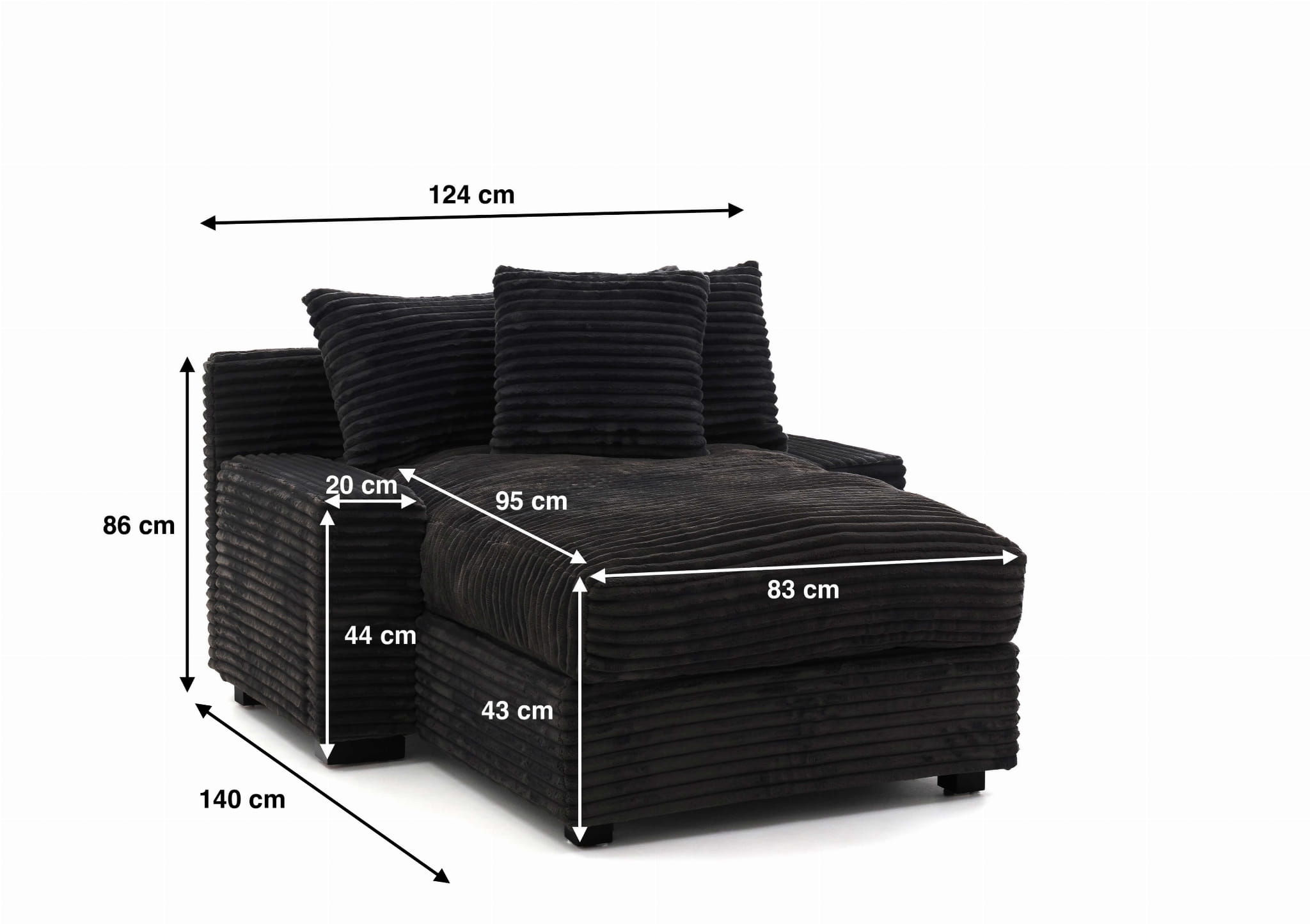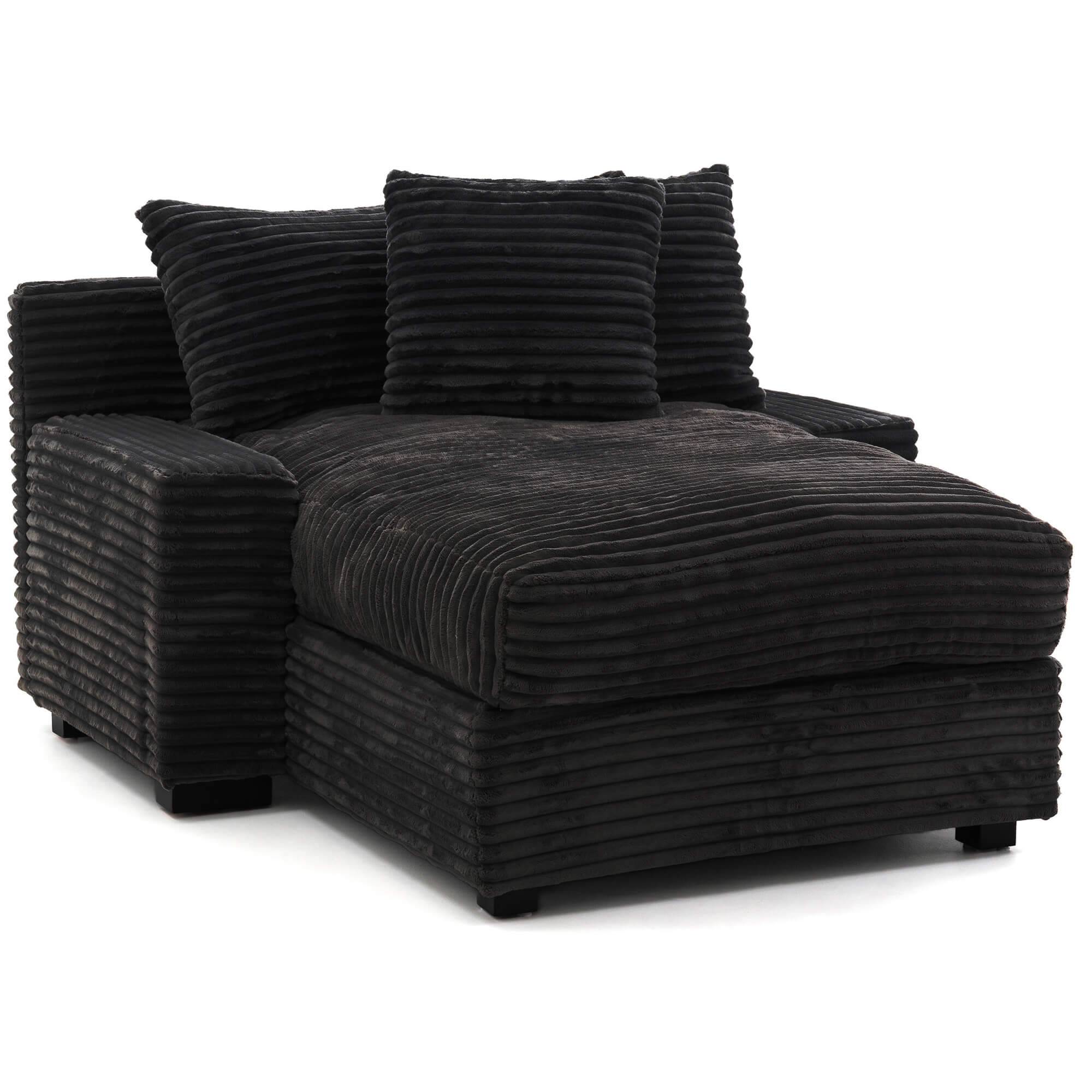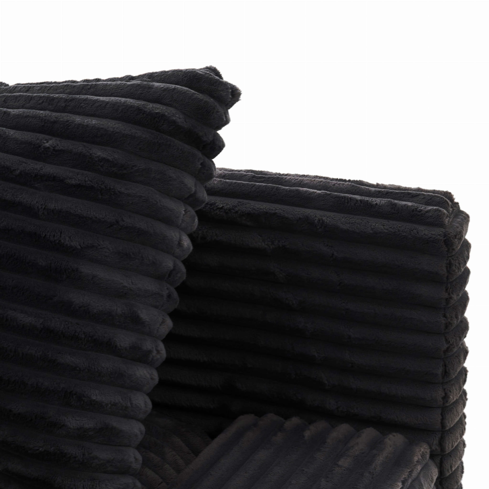 Geometryczna forma i wyraziste poziome przeszycia nadają Austinowi charakteru nowoczesnego, „miękkiego” loftu – wygląda jak mebel z designerskiego apartamentu, ale bez zadęcia: jest po prostu wygodny, przytulny i bardzo „domowy”. Czarna sztruksowa tapicerka pięknie łapie światło, podkreślając strukturę prążków, a przy tym jest przyjemna w dotyku i sprzyja długiemu leniuchowaniu.