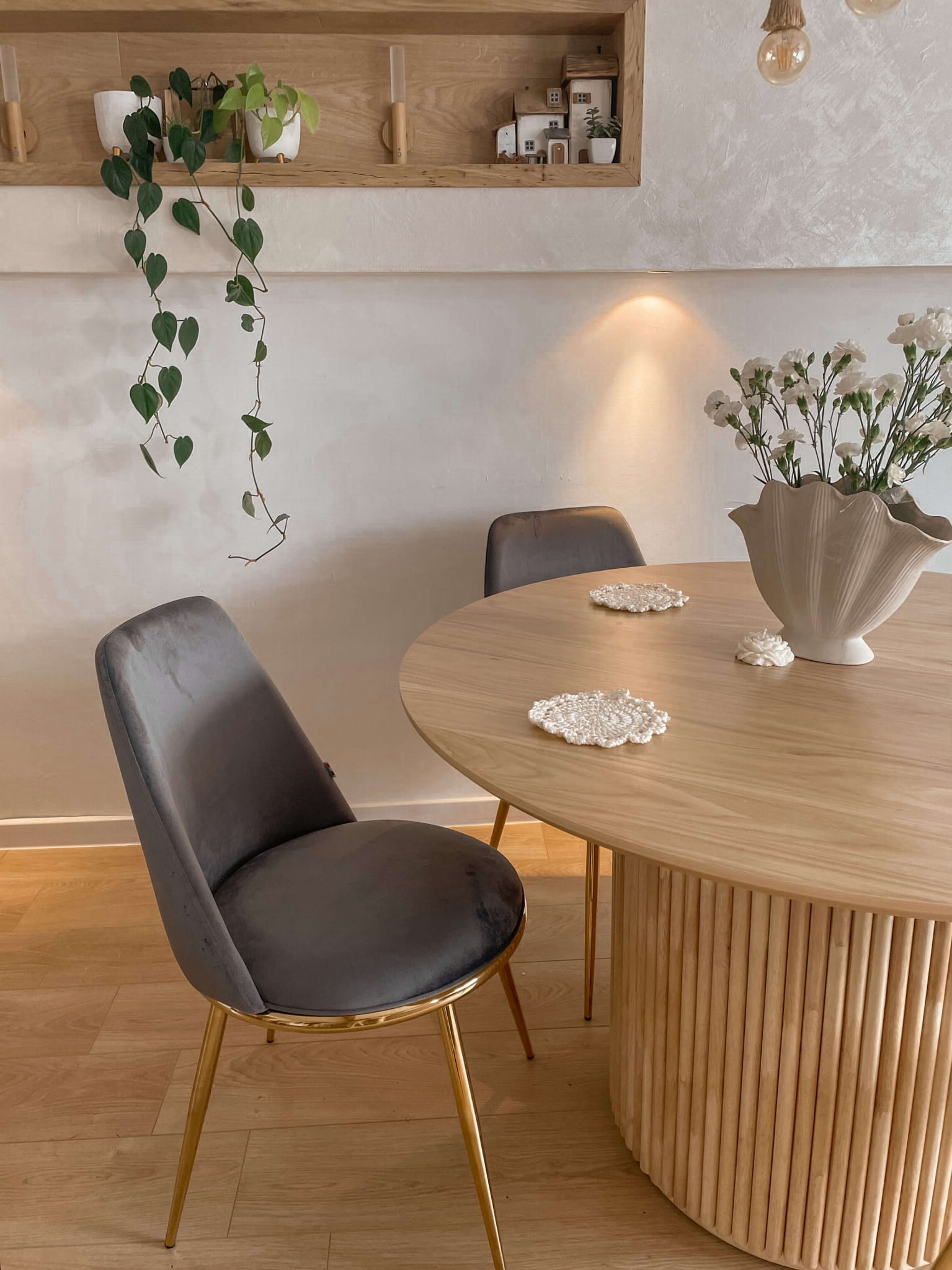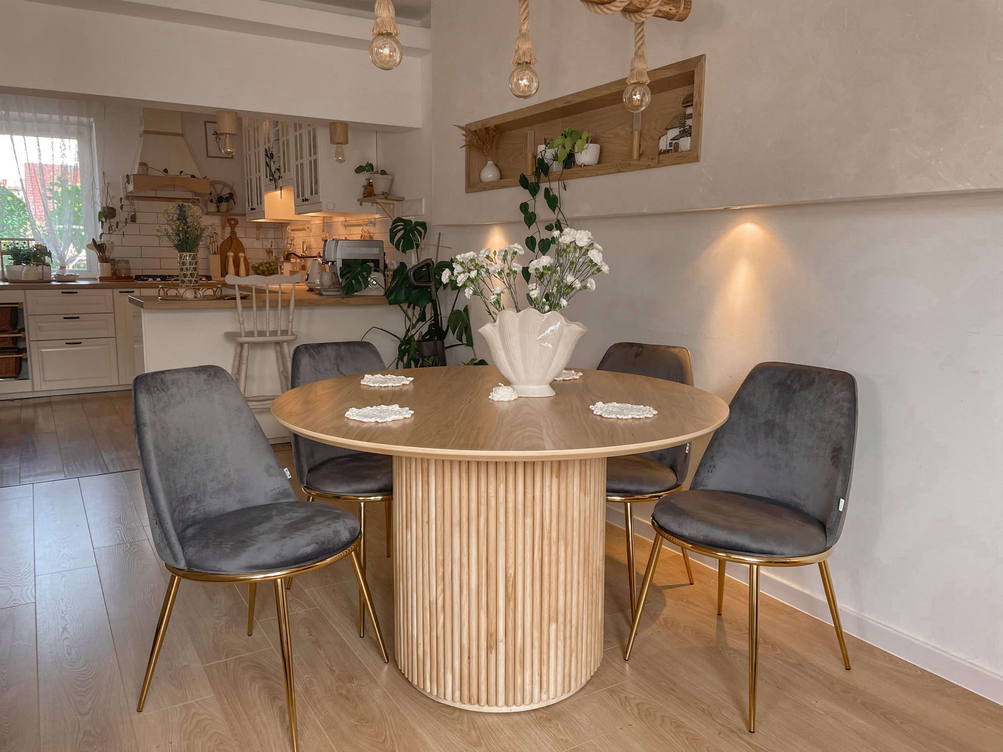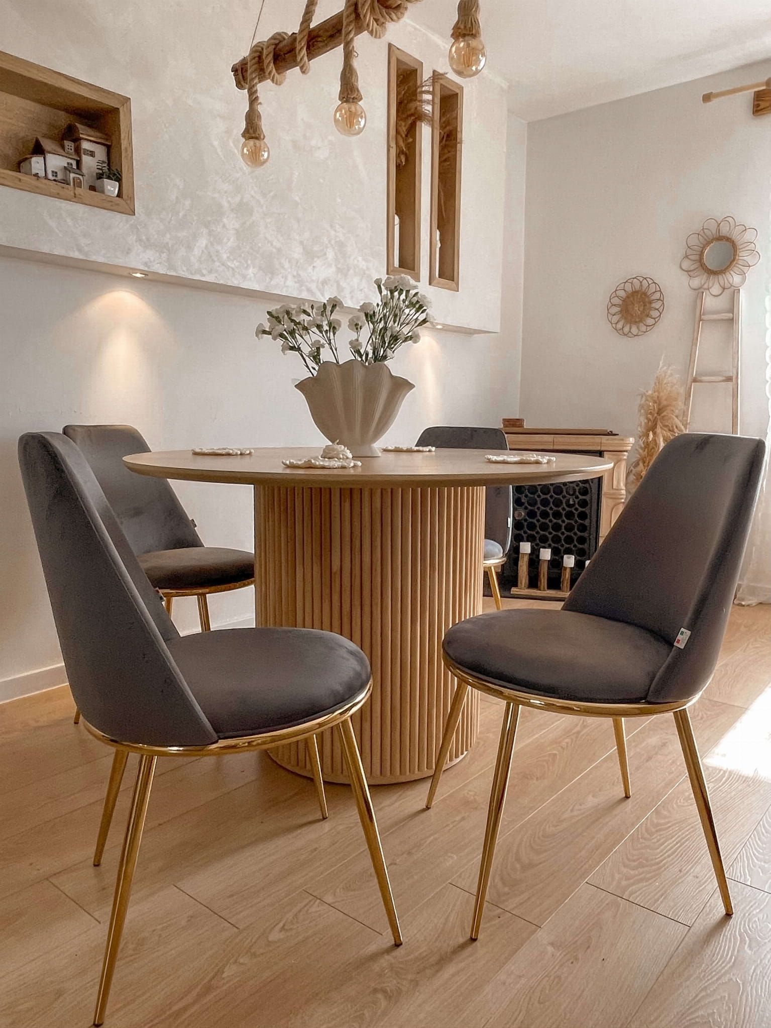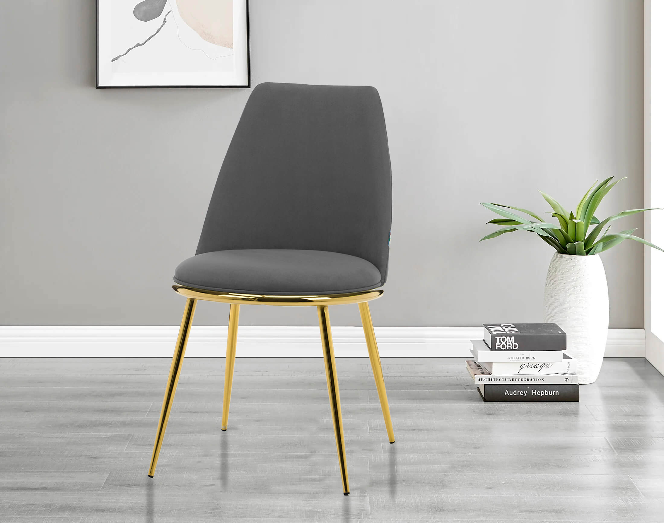 Nogi krzesła wykonane są z solidnego metalu, który został starannie wykończony w kolorze złota. Ten delikatny odcień złota nadaje krzesłu subtelności i luksusowego wyglądu, jednocześnie tworząc harmonijną kompozycję z szarym welurem. Wyprofilowane oparcie i miękkie, wyściełane siedzisko gwarantują optymalne wsparcie dla pleców i maksymalną wygodę, niezależnie od tego, czy siedzisz przy biurku, jadasz posiłek czy relaksujesz się przy czytaniu.