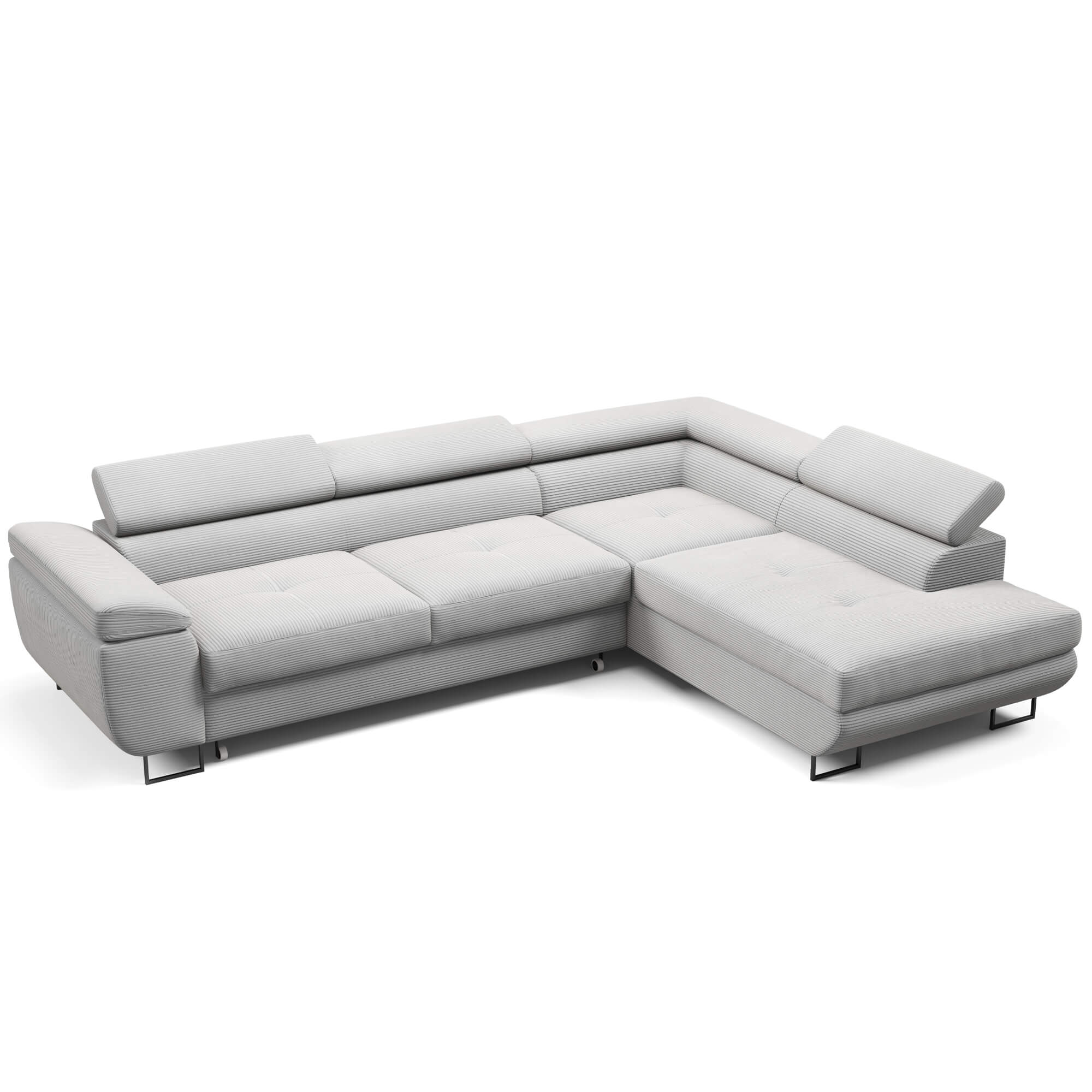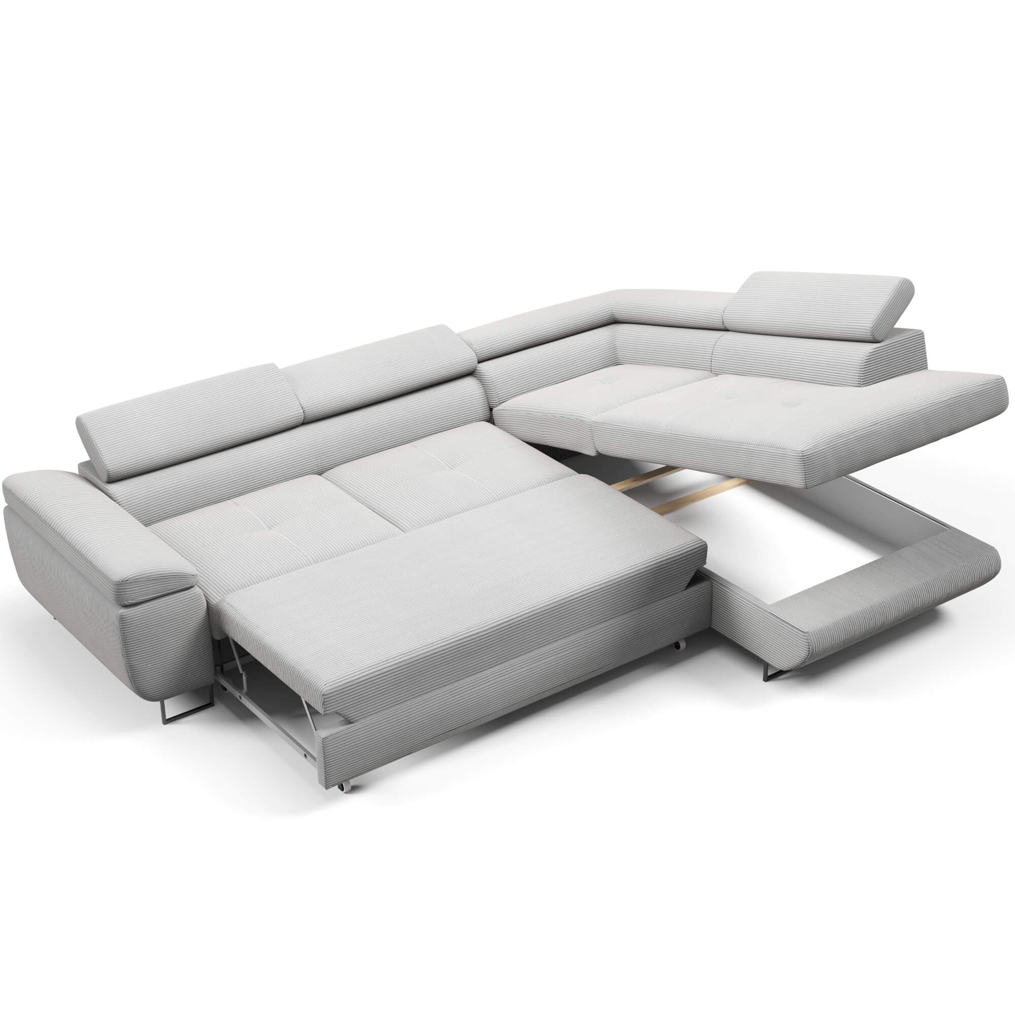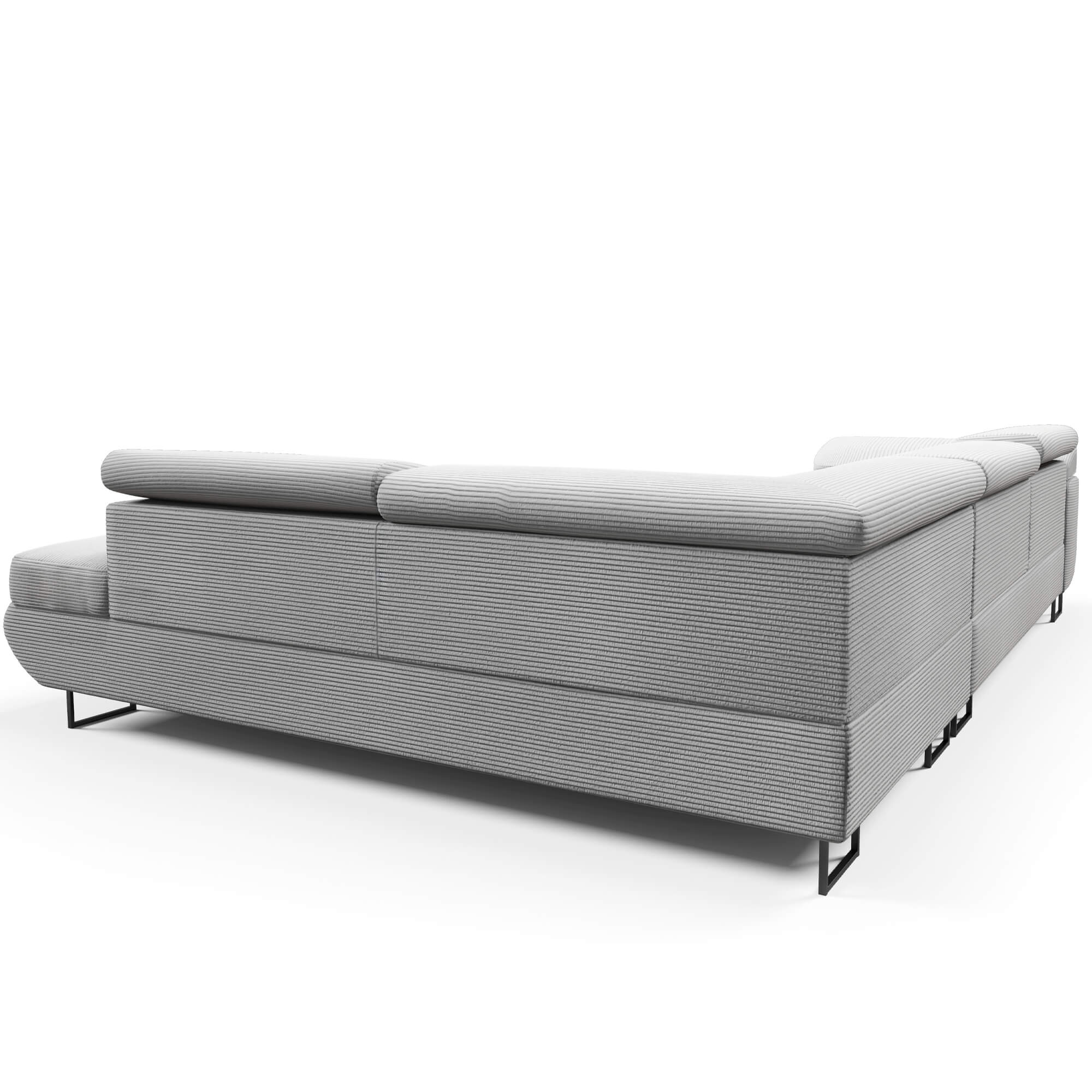 Narożnik L-kształtny ANTON szara tkanina sztruksowa z funkcją spania, regulowanymi zagłówkami oraz pojemnikiem na pościel