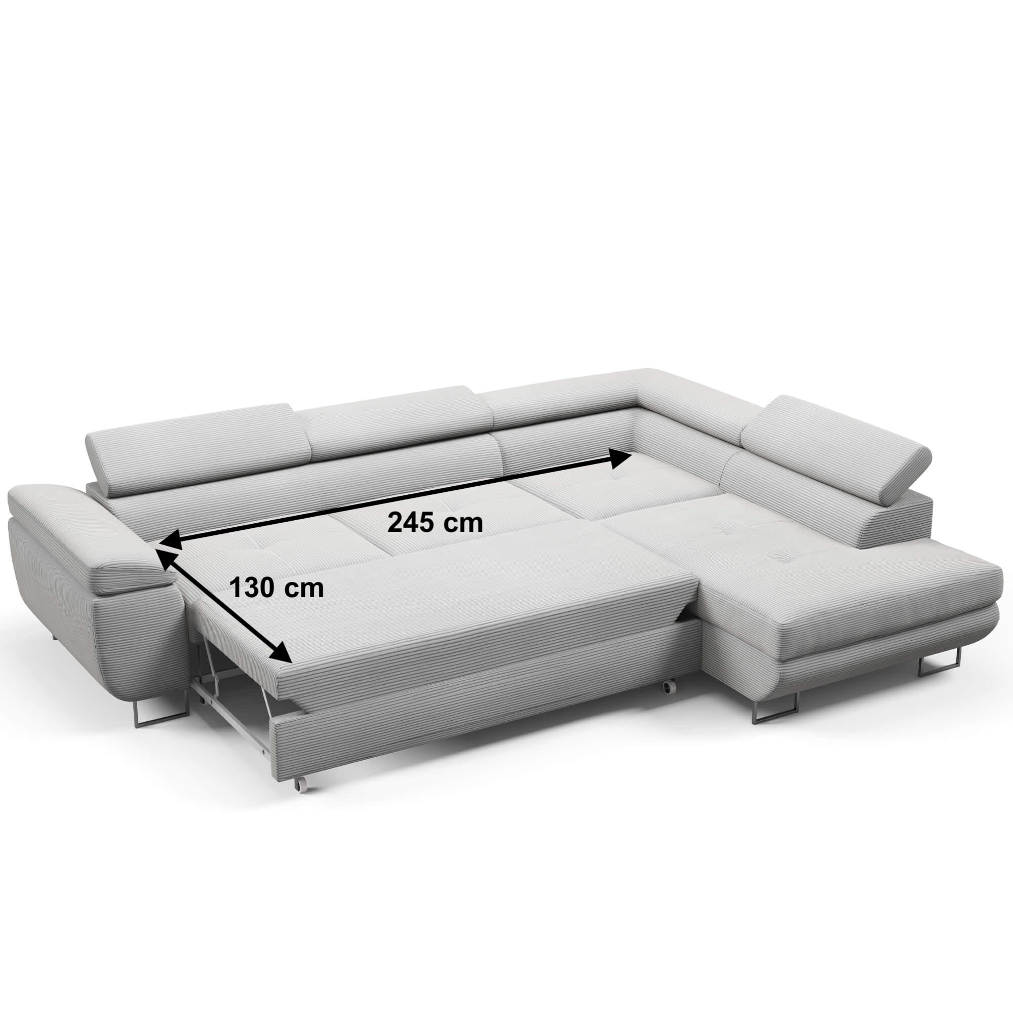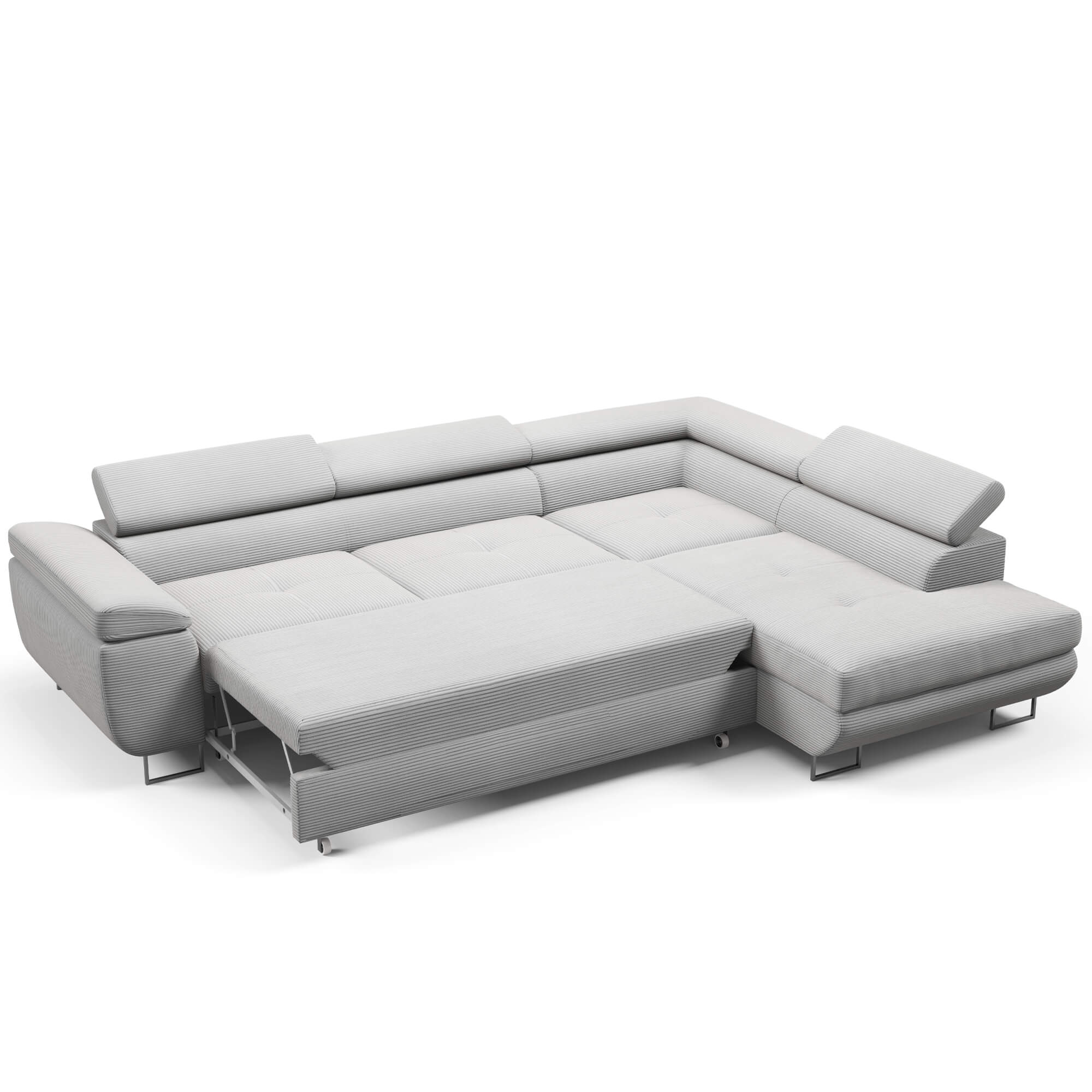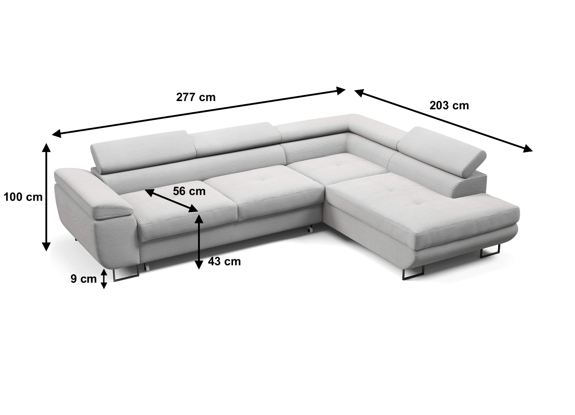 Narożnik L-kształtny ANTON szara tkanina sztruksowa z funkcją spania, regulowanymi zagłówkami oraz pojemnikiem na pościel