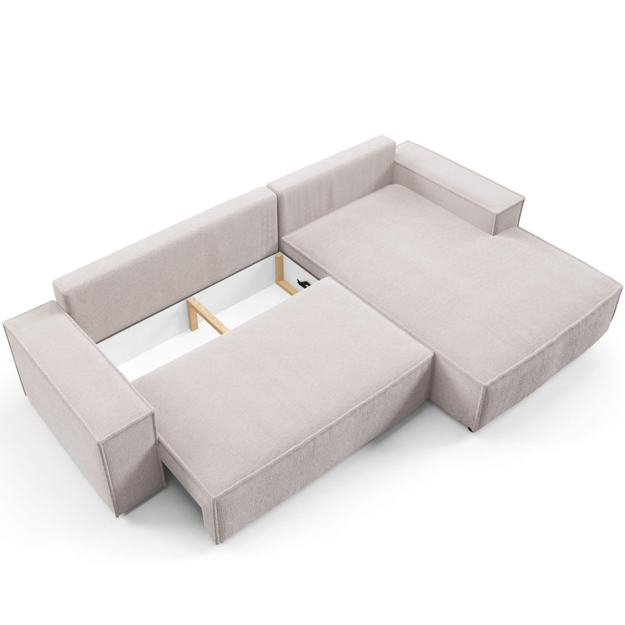 - Pojemnik na pościel: Laminowana skrzynka na pościel ukryta pod siedziskiem zapewnia dodatkową przestrzeń do przechowywania, pomagając utrzymać porządek w salonie.