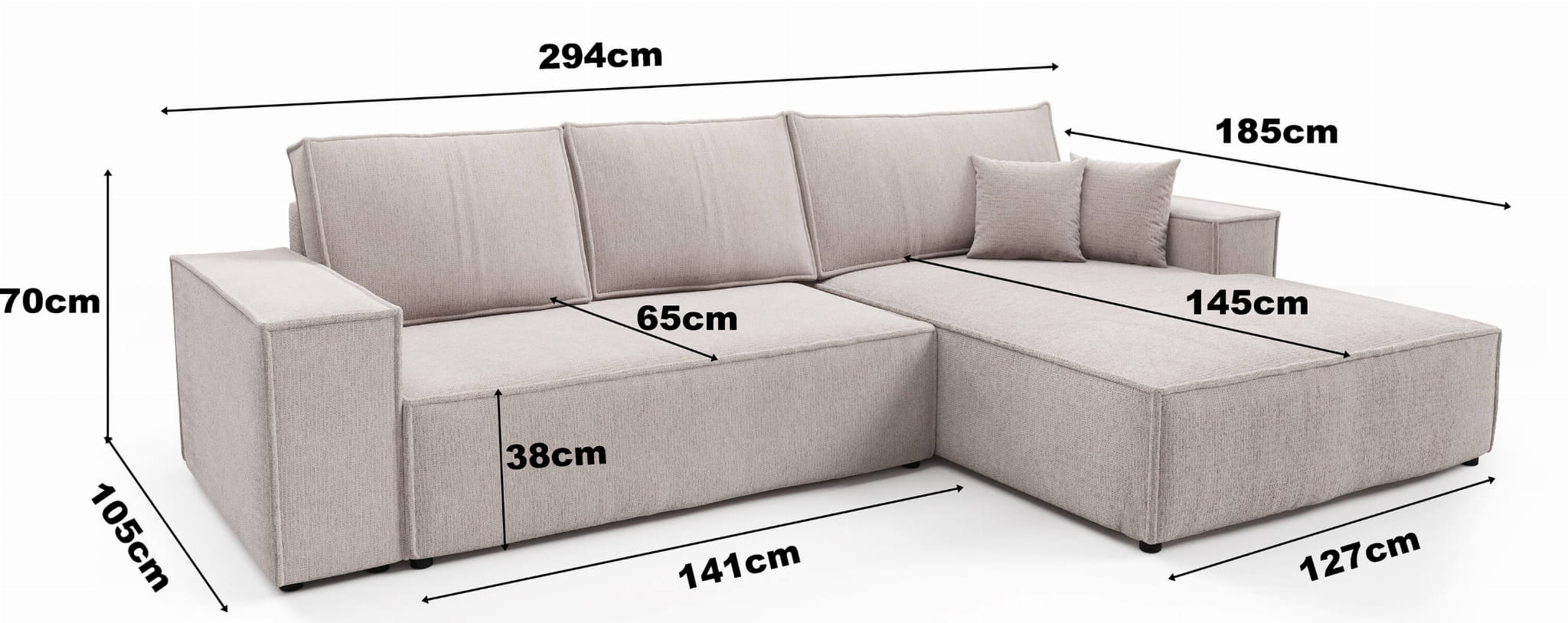- Funkcja spania: Narożnik Aragon wyposażony jest w funkcję spania o wymiarach 140 x 244 cm, co czyni go idealnym rozwiązaniem zarówno na co dzień, jak i podczas przyjmowania gości.