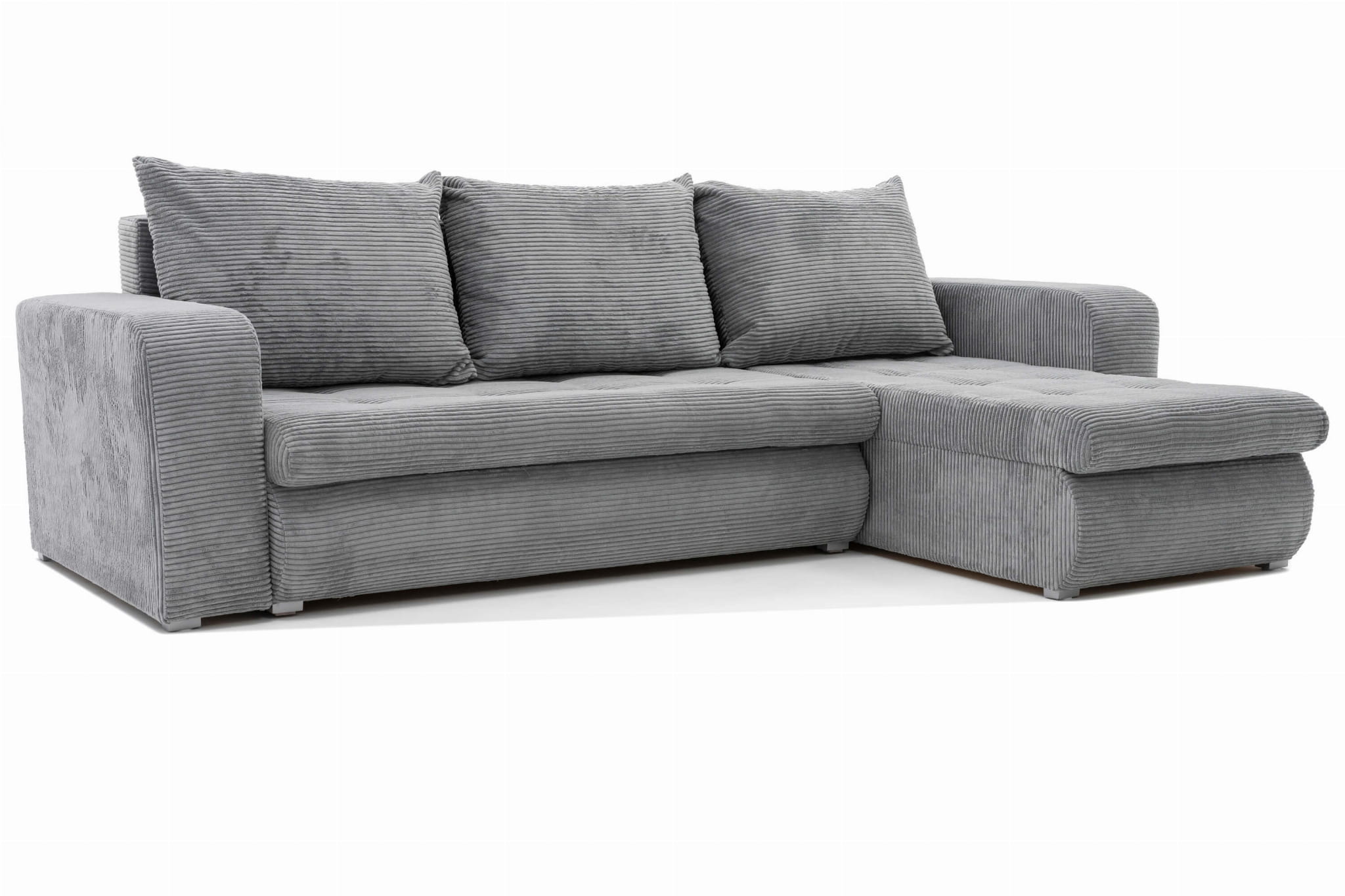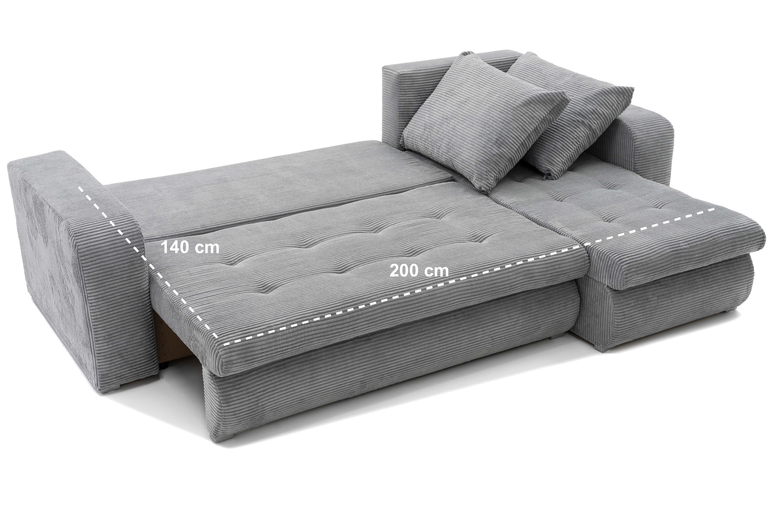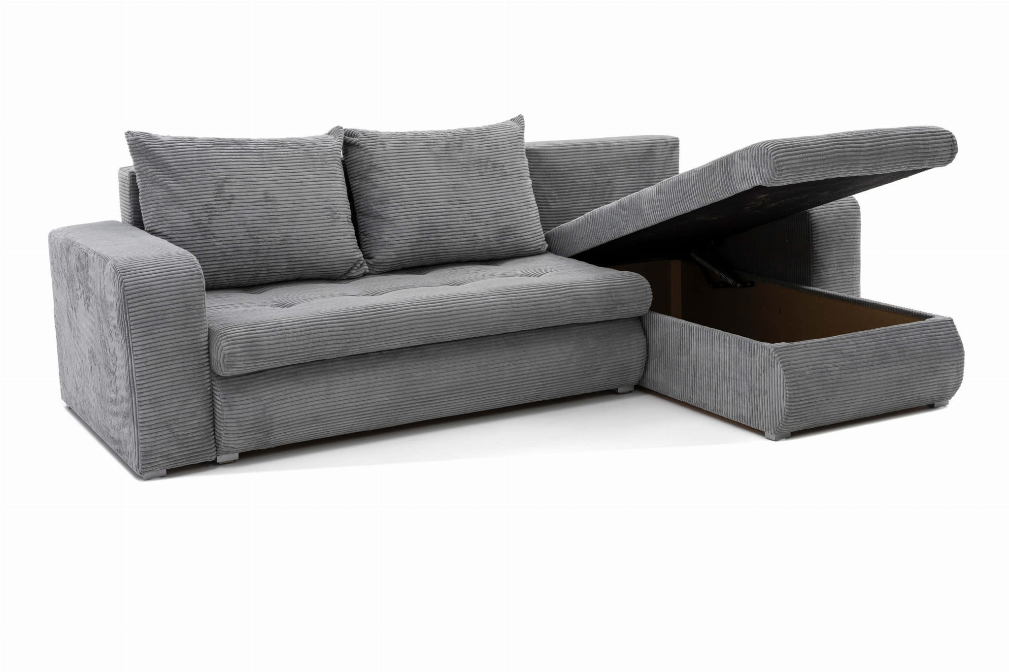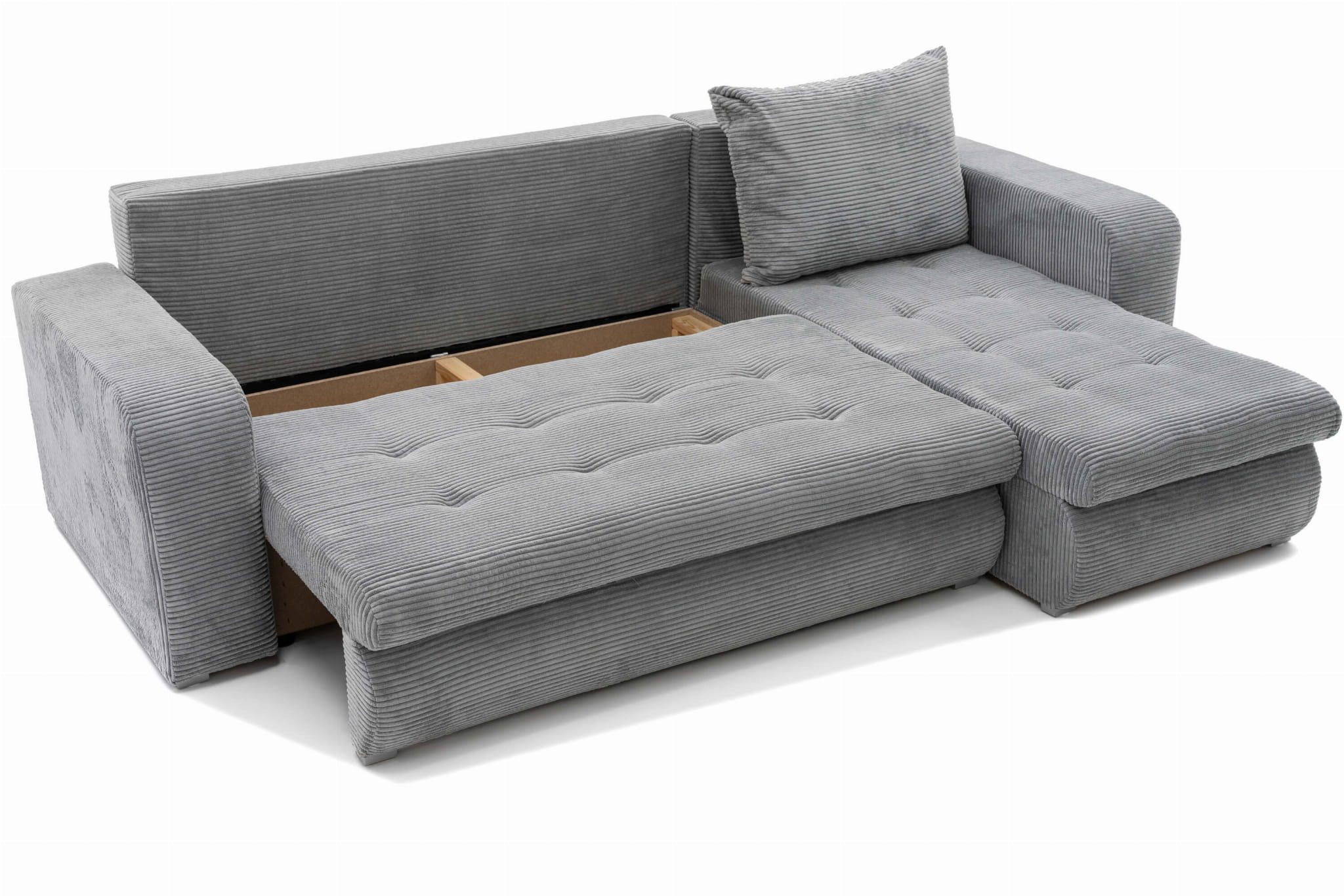 Narożnik L-kształtny BOSTON szara tkanina sztruksowa z funkcją spania oraz pojemnikiem na pościel tani nowoczesny