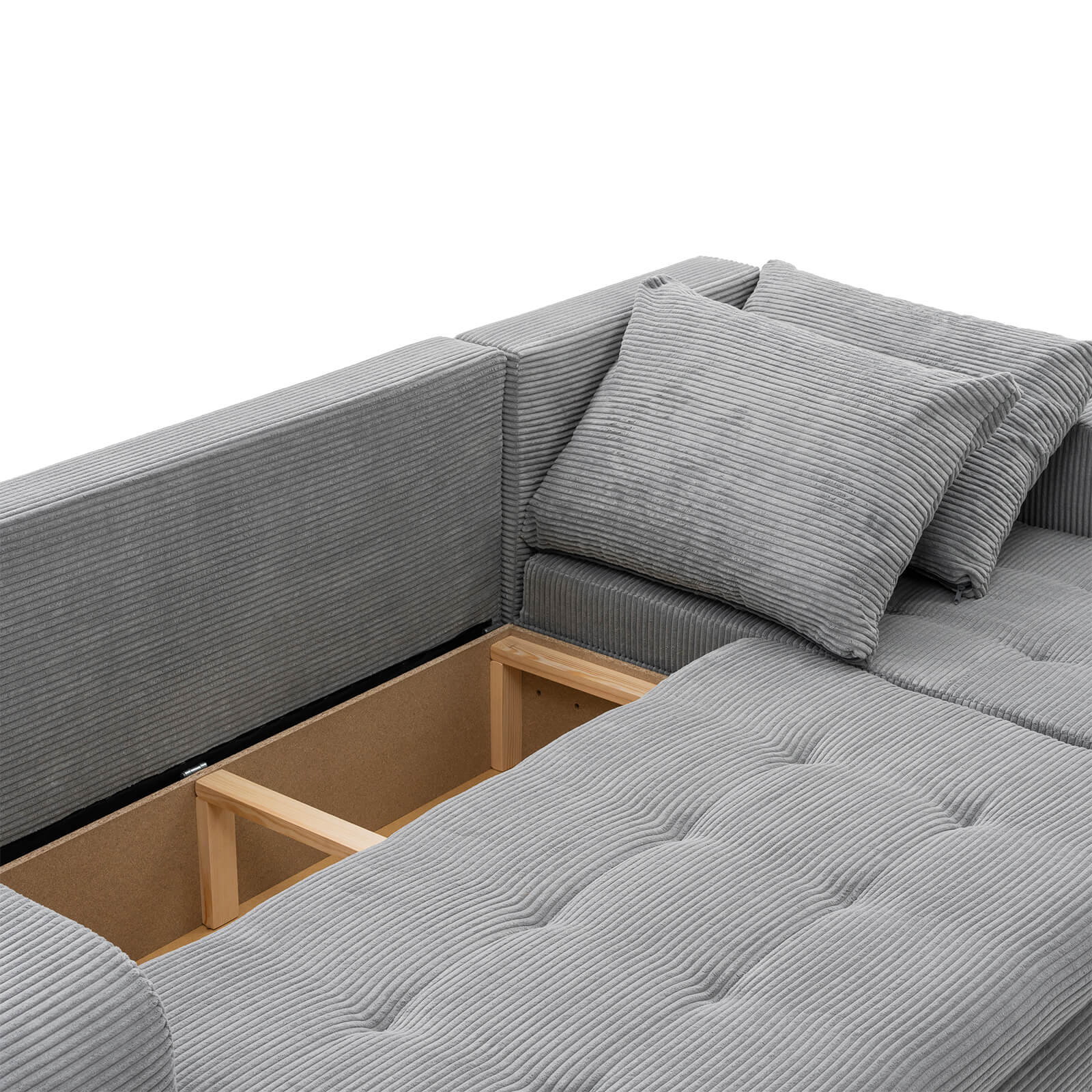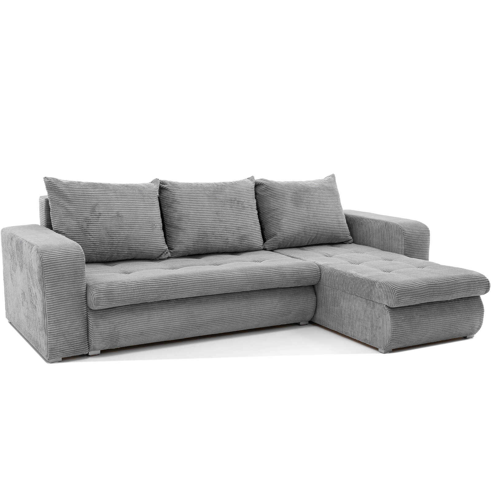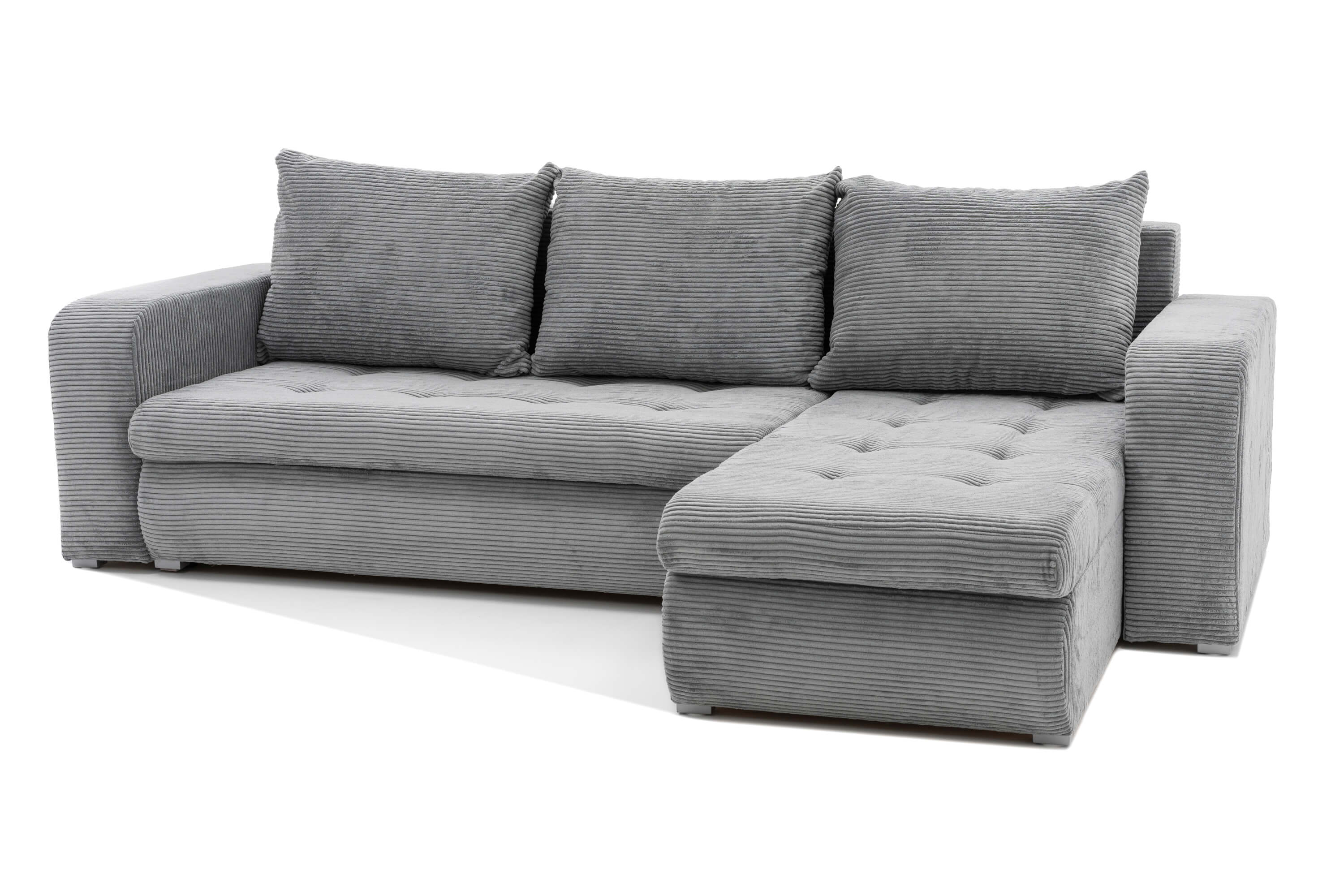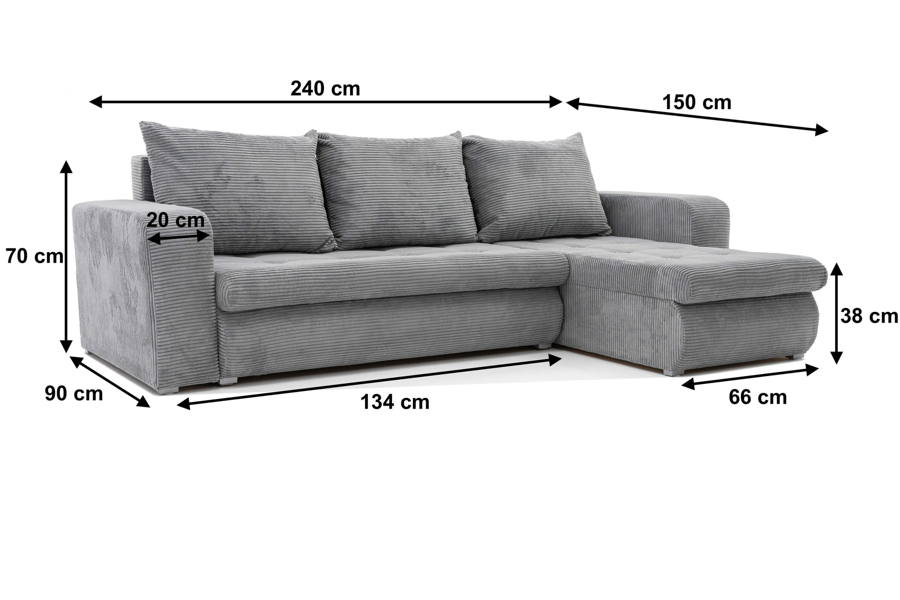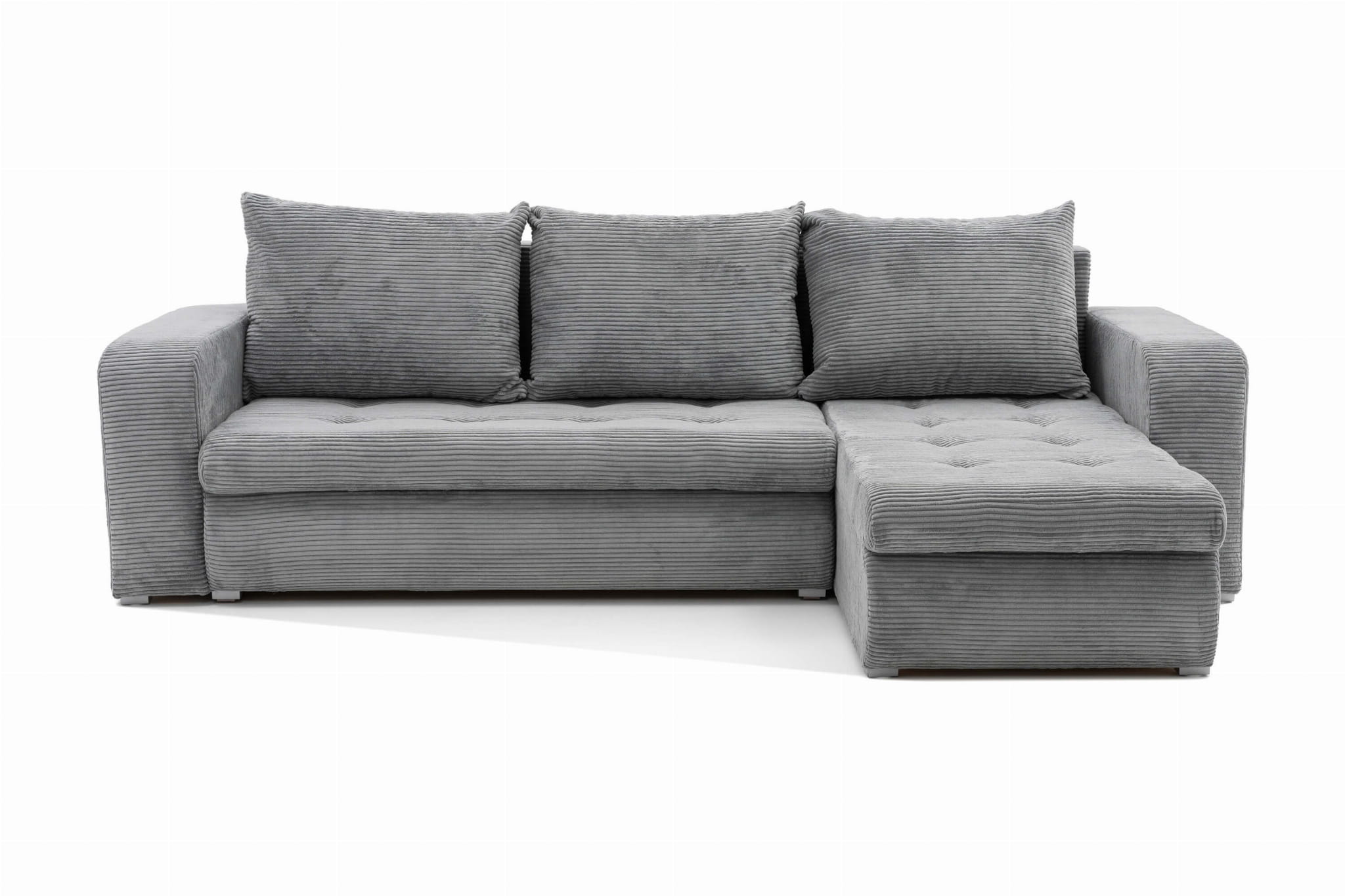 Narożnik L-kształtny BOSTON szara tkanina sztruksowa z funkcją spania oraz pojemnikiem na pościel tani nowoczesny