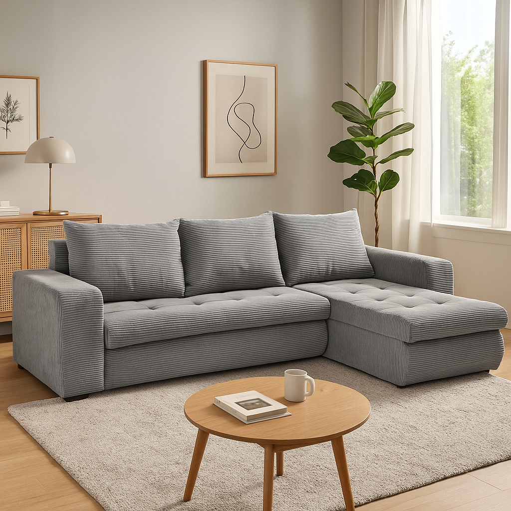 Strona do wyboru podczas montażu: Narożnik został zaprojektowany w taki sposób, by dostosować się do różnorodnych aranżacji wnętrza. Dzięki możliwości wyboru strony podczas montażu, łatwo dopasujesz go do swojego salonu niezależnie od konfiguracji pomieszczenia.