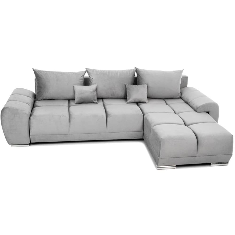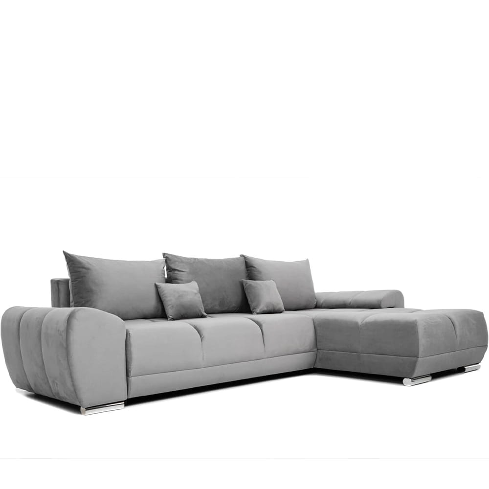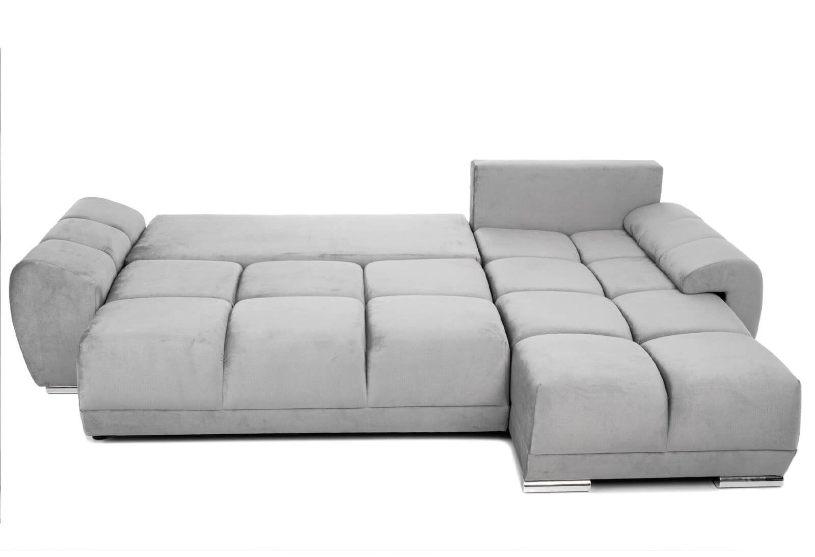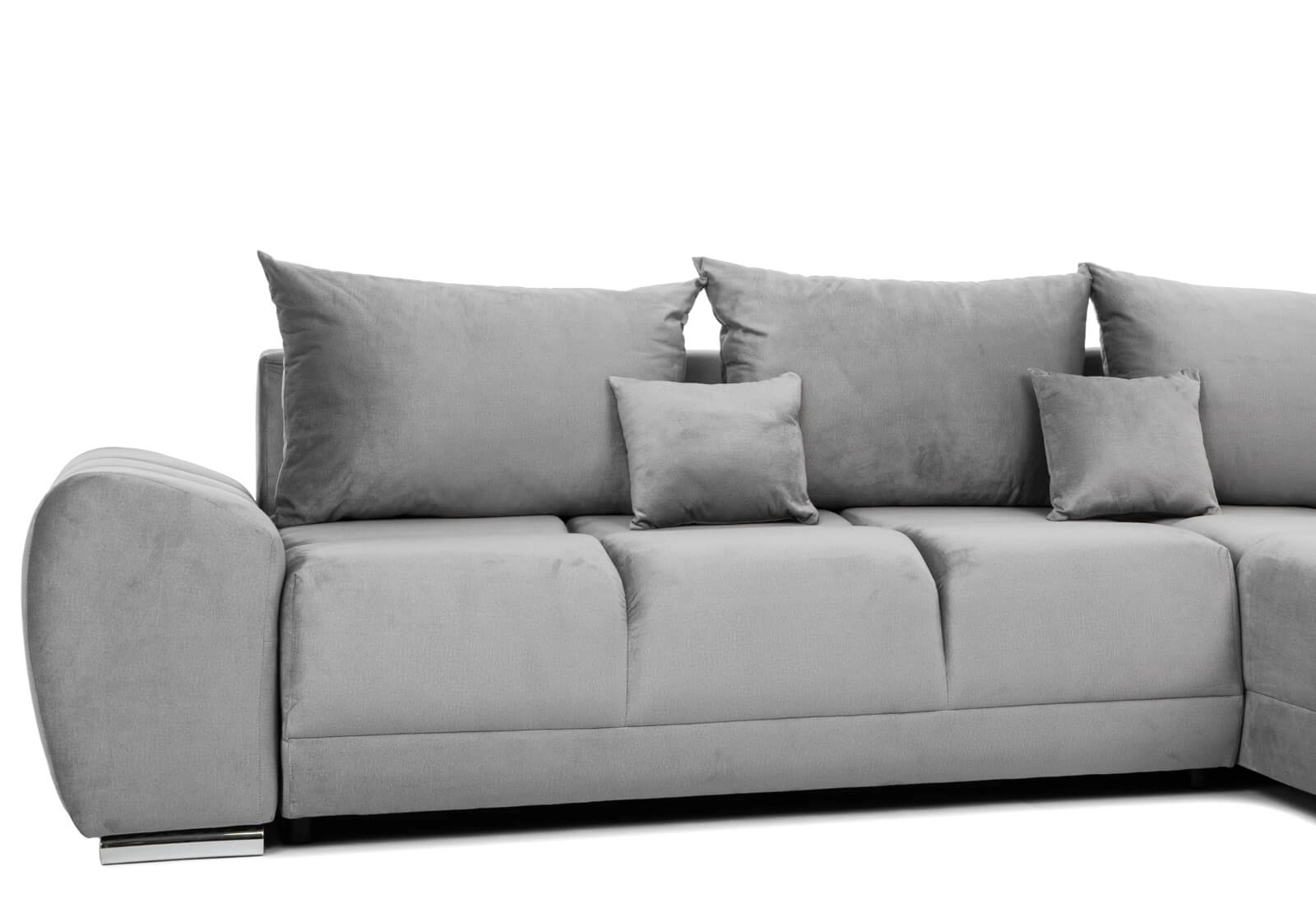 Narożnik L-kształtny NAOMI szary welurowy z funkcją spania oraz pojemnikiem na pościel nowoczesny loftowy