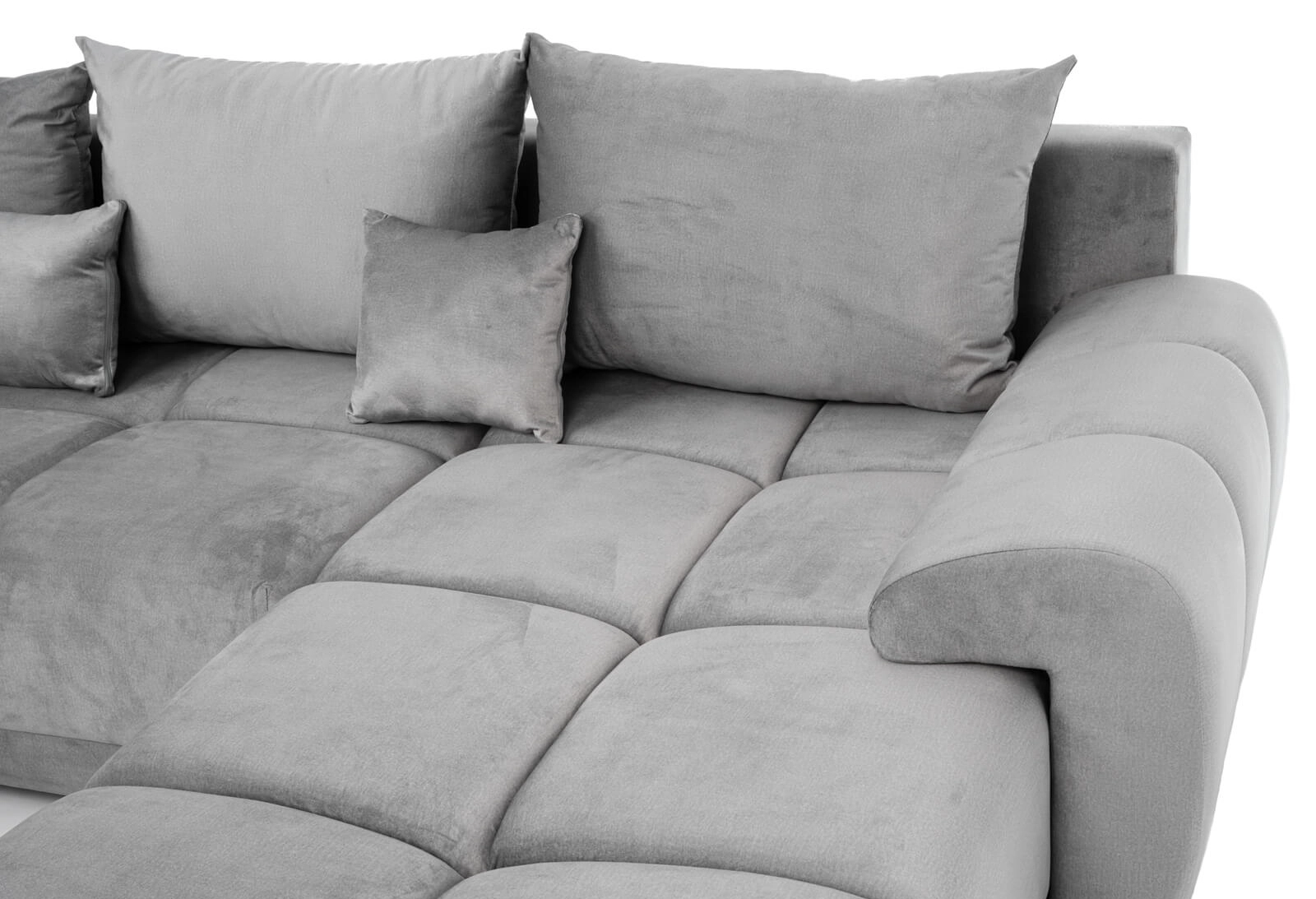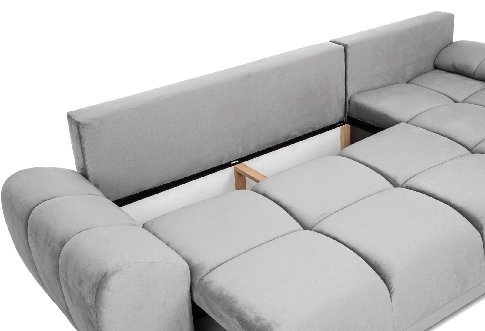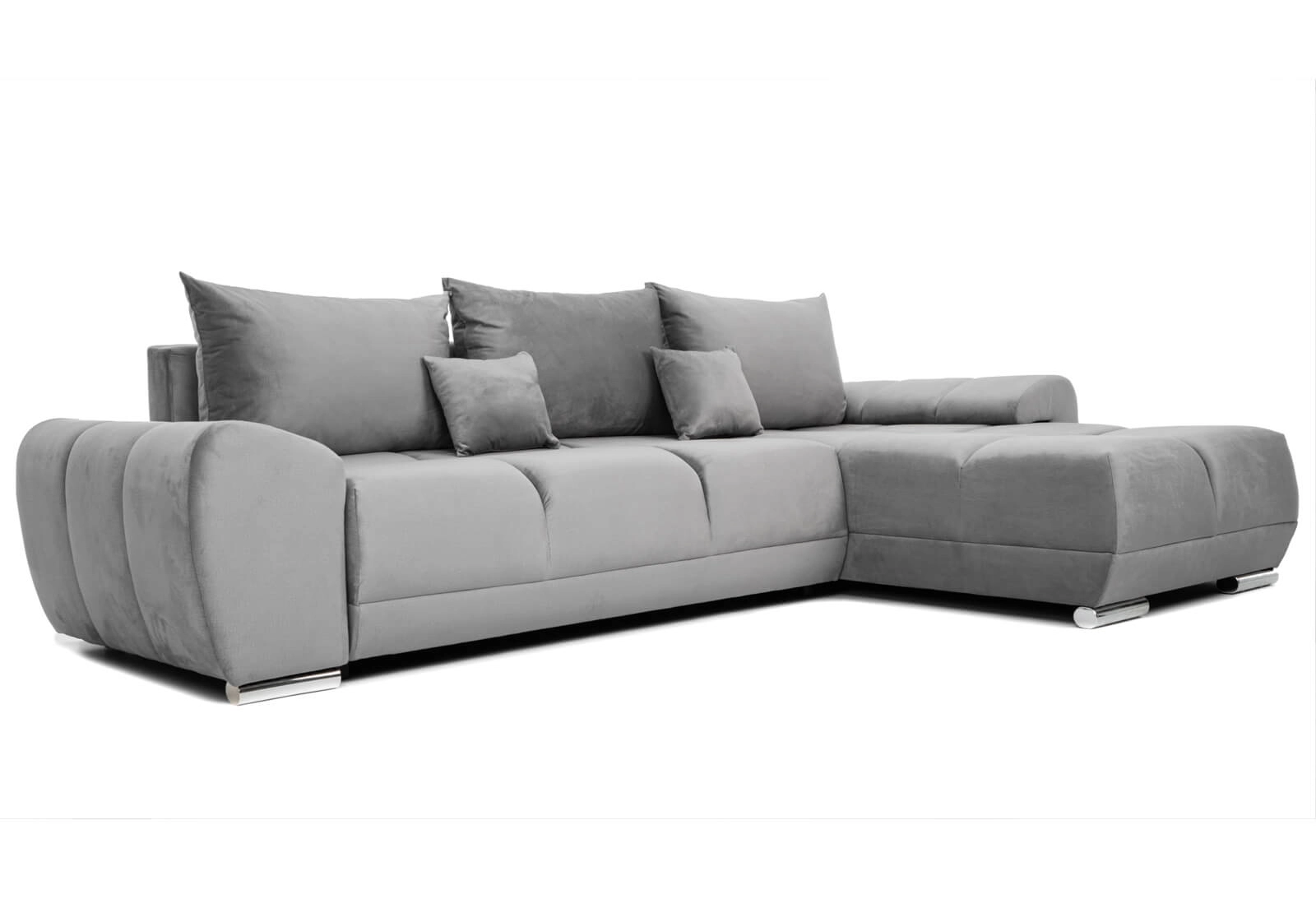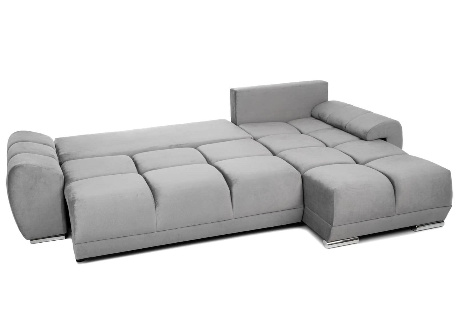 Narożnik L-kształtny NAOMI szary welurowy z funkcją spania oraz pojemnikiem na pościel nowoczesny loftowy