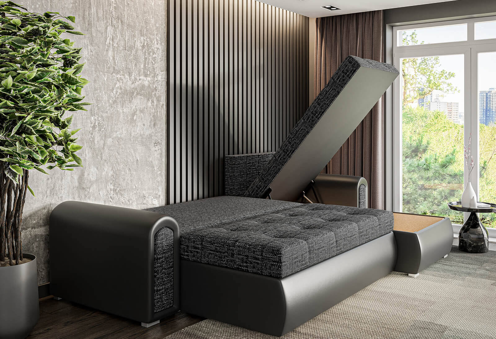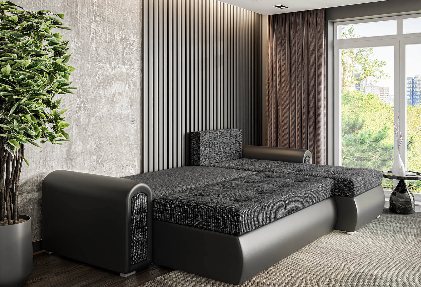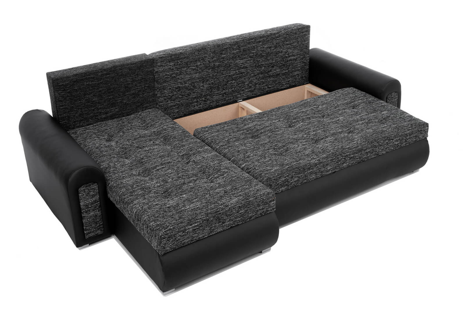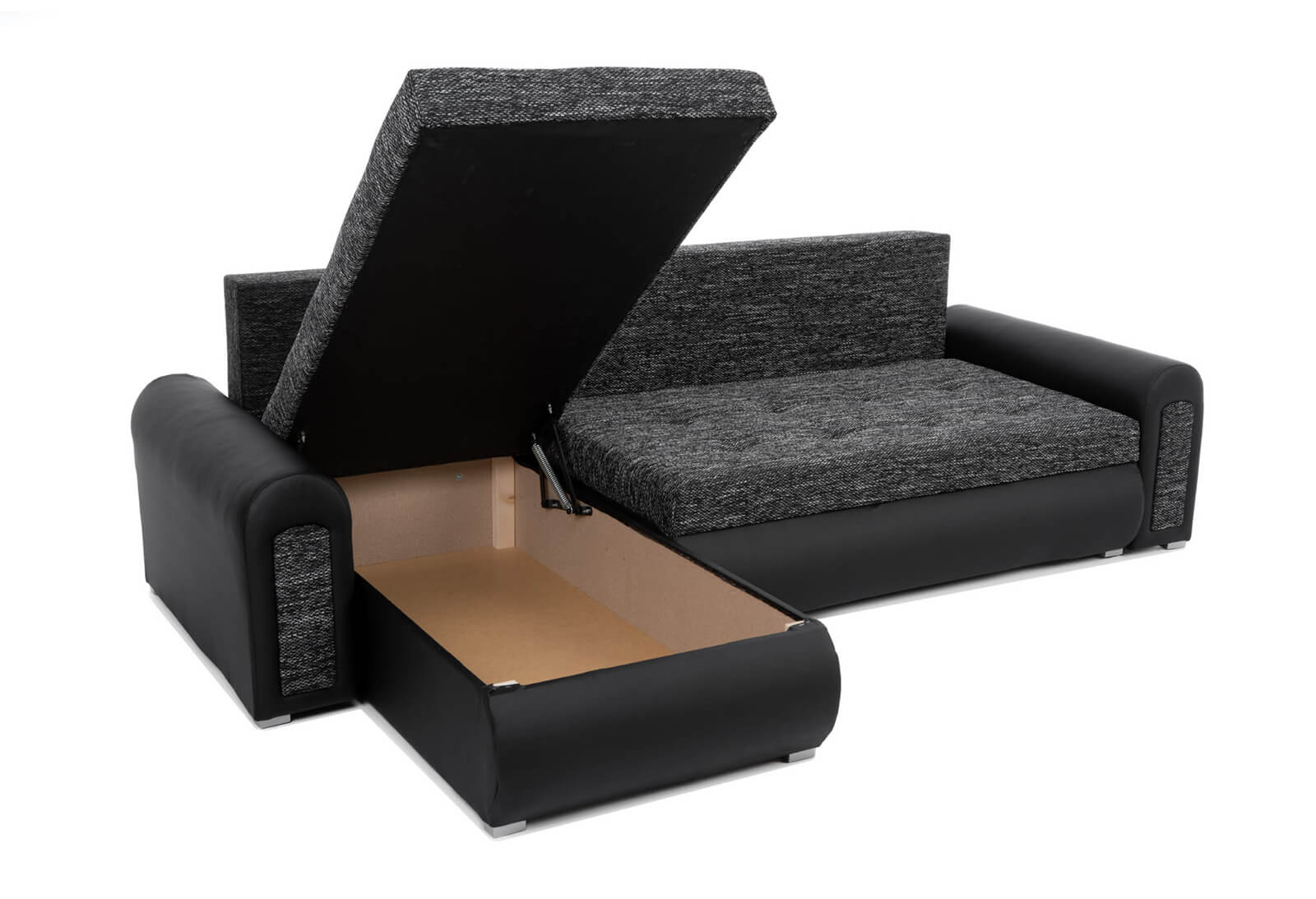 Narożnik L-kształtny RELAX szara tkanina plecionkowa + czarna ekoskóra z funkcją spania oraz pojemnikiem na pościel