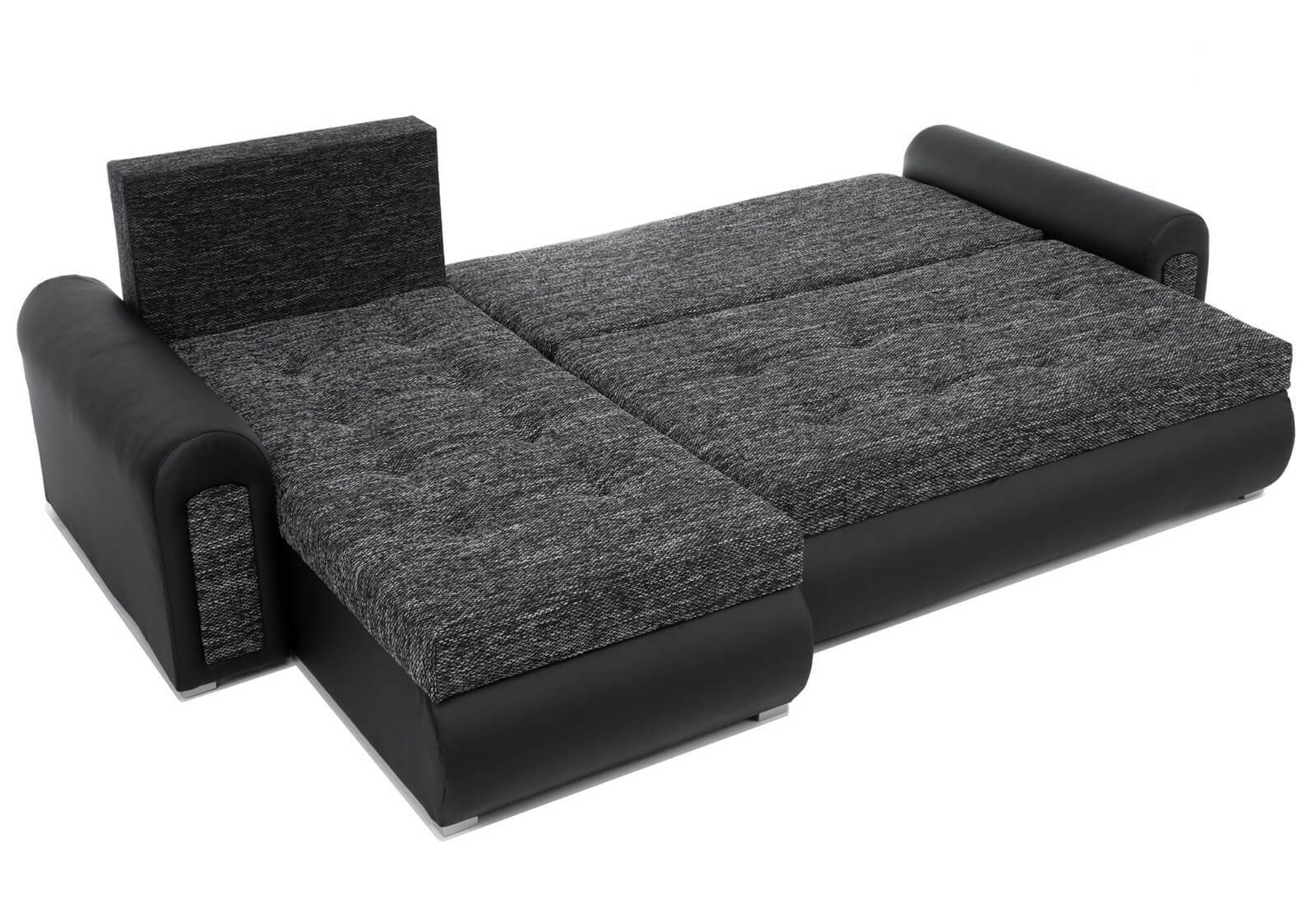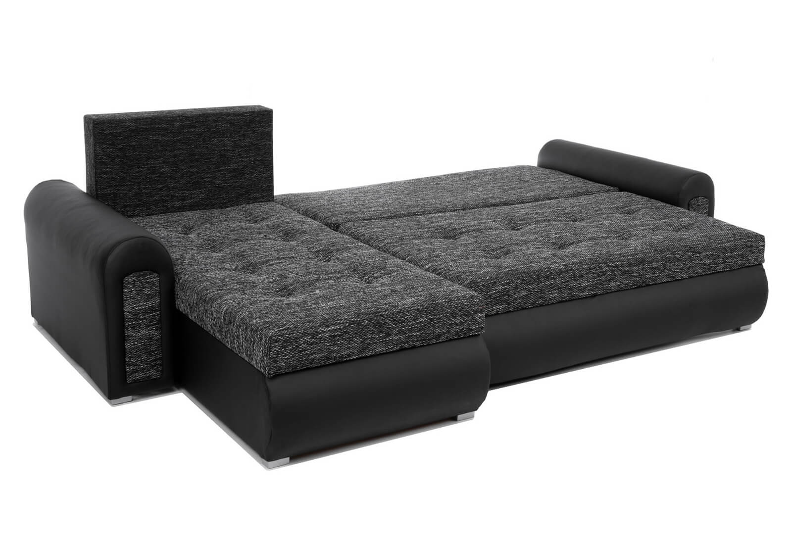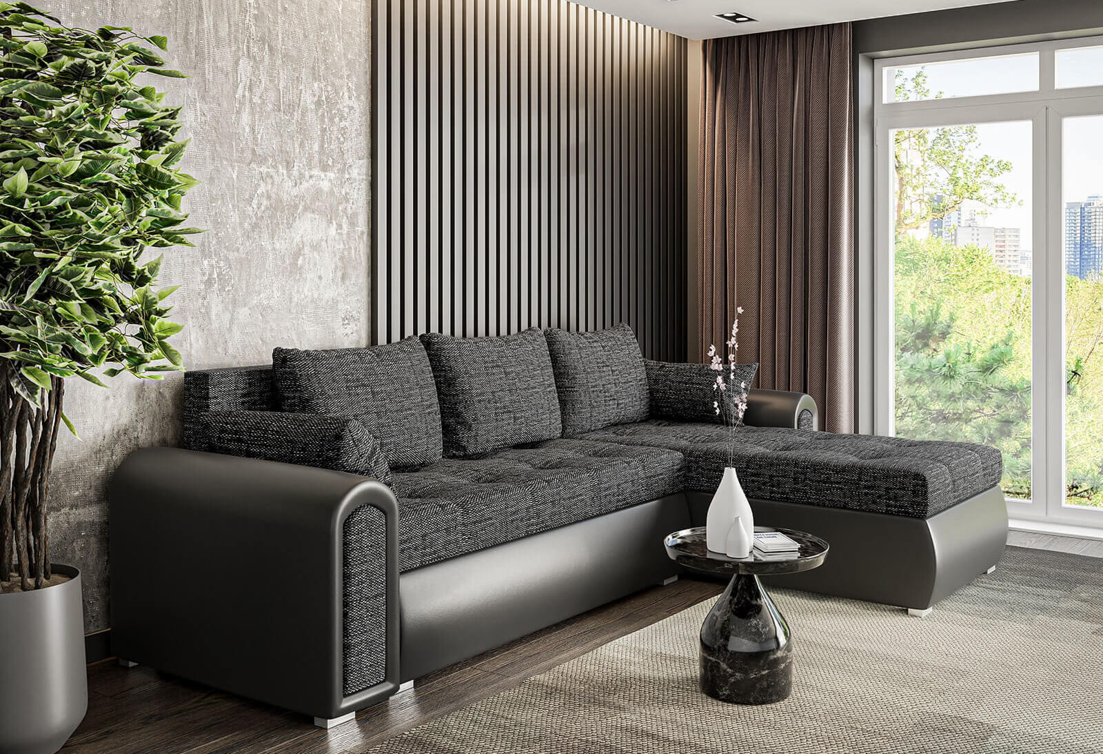 Narożnik L-kształtny RELAX szara tkanina plecionkowa + czarna ekoskóra z funkcją spania oraz pojemnikiem na pościel