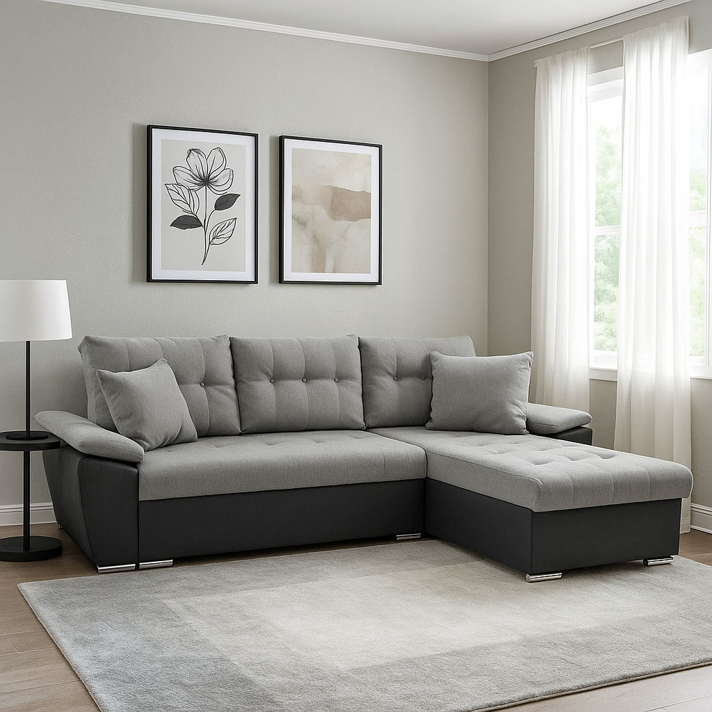 Elegancki i wszechstronny, Vegas doskonale wpisuje się w nowoczesne trendy designu, oferując wygodne siedzisko oraz przestronne łóżko w jednym meblu. Jego stylowy, jasnoszary odcień i subtelne linie nadają wnętrzu lekkości i nowoczesności, podkreślając jego uniwersalny charakter. Nic jednak nie stoi na przeszkodzie, aby zmodyfikować jego kolorystykę, korzystając z dostępnej palety tkanin. Z myślą o maksymalnym komforcie, narożnik wyposażony został w system łatwego rozkładania, który umożliwia szybką transformację z sofowego ustawienia w pełnowymiarowe łóżko, gotowe na przyjęcie gości.