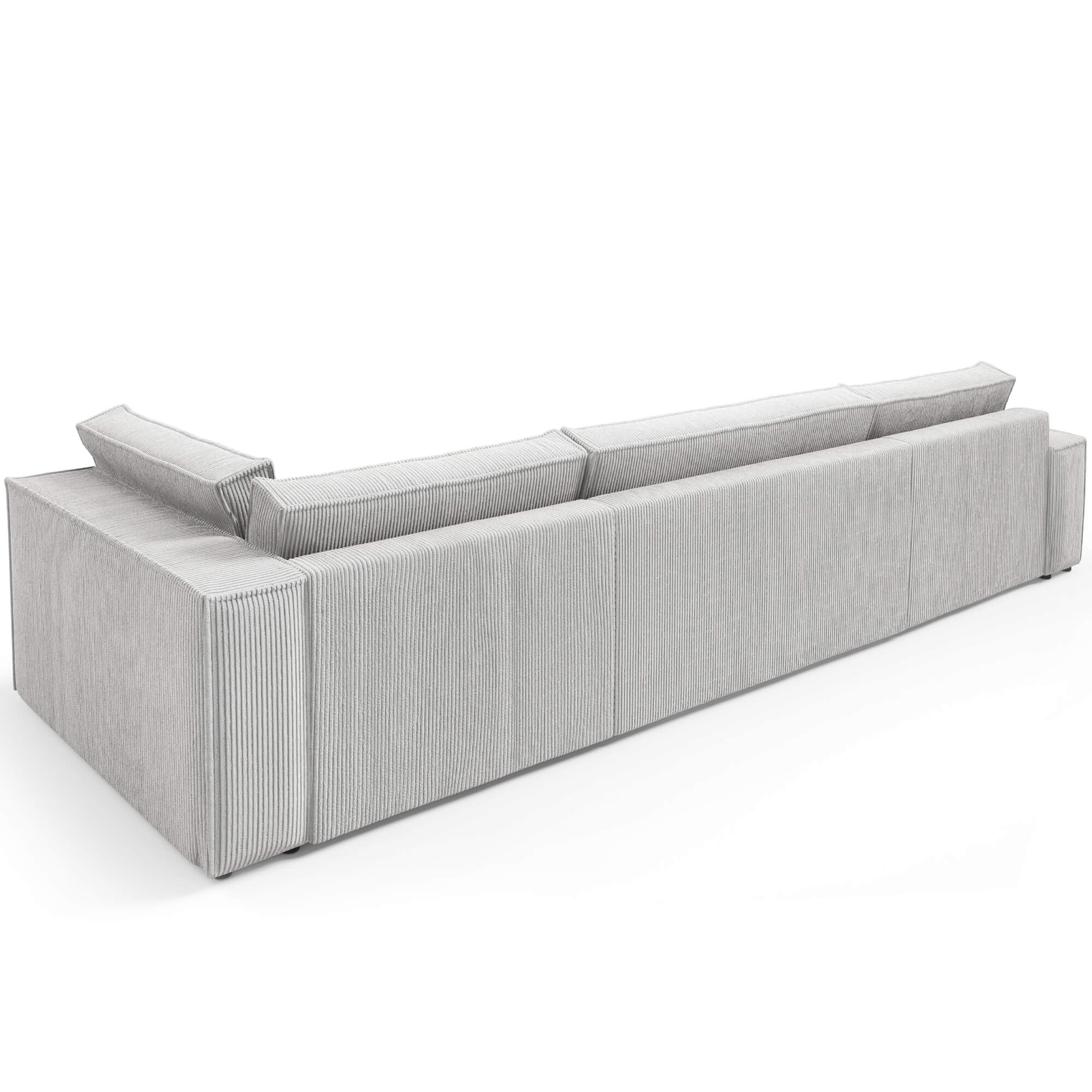 Wolnostojący design z tyłem obitym tkaniną pozwala na ustawienie narożnika w dowolnym miejscu salonu, zapewniając elegancki wygląd z każdej perspektywy.