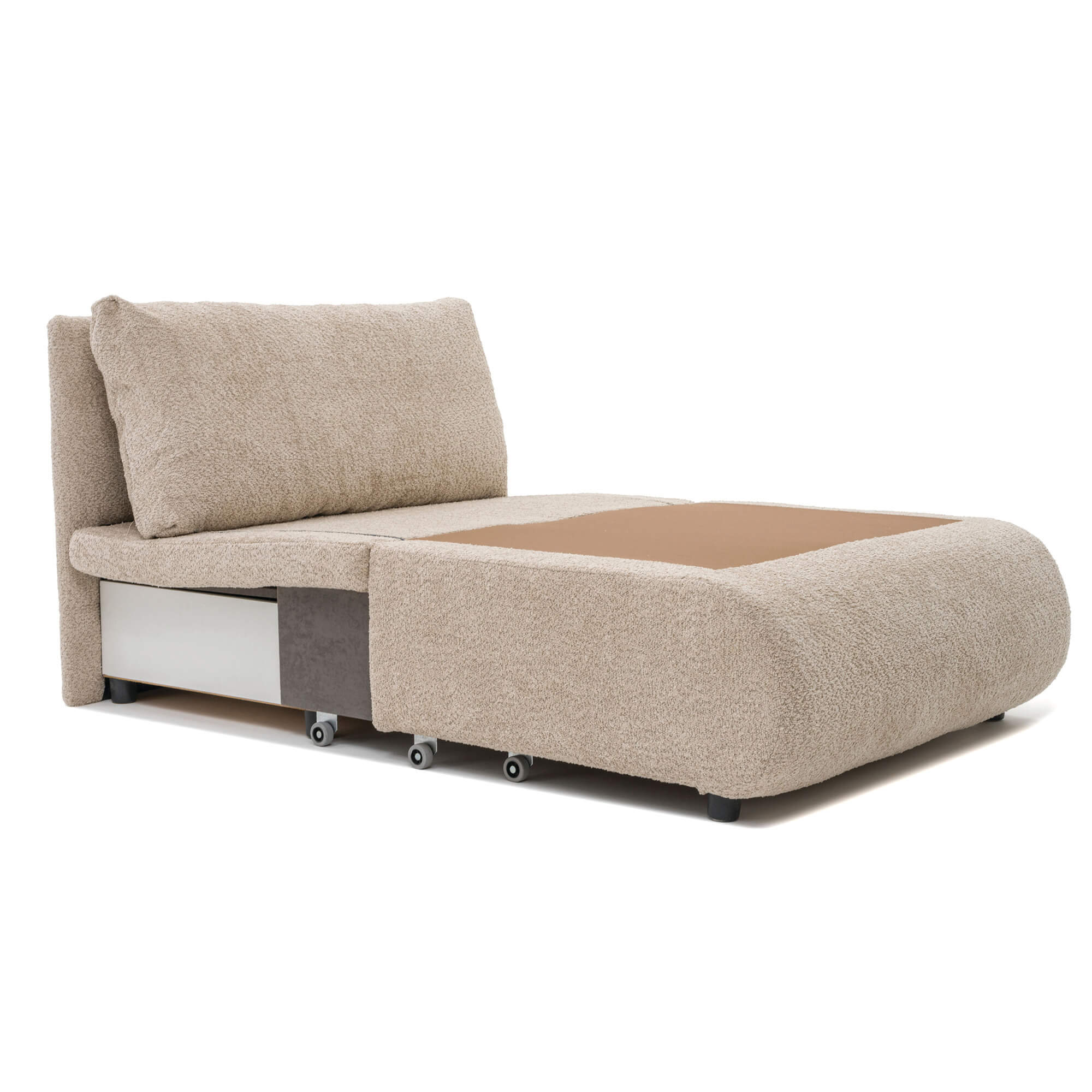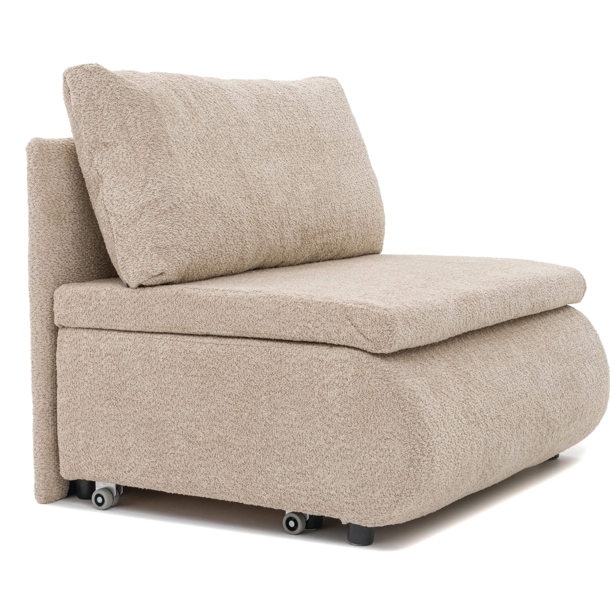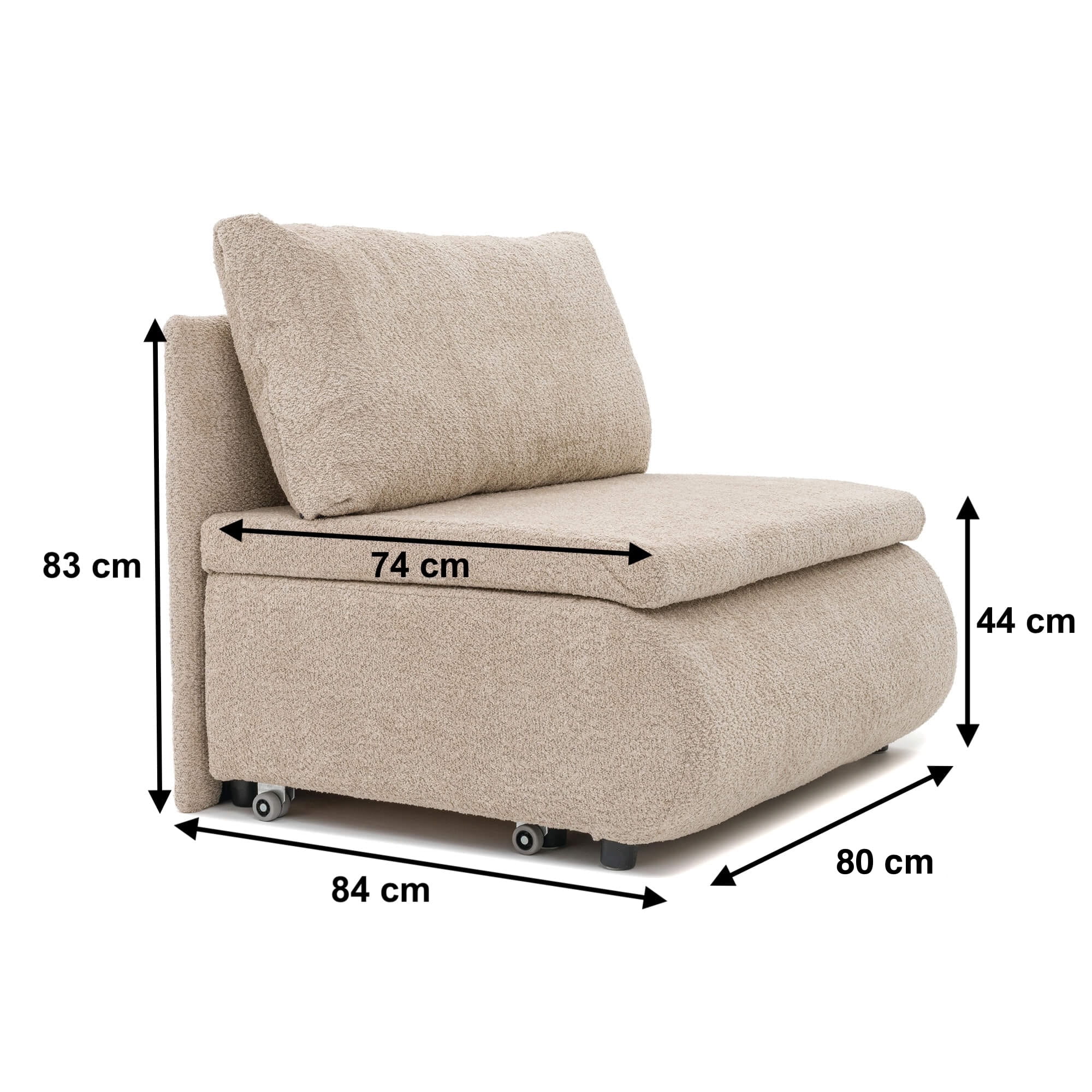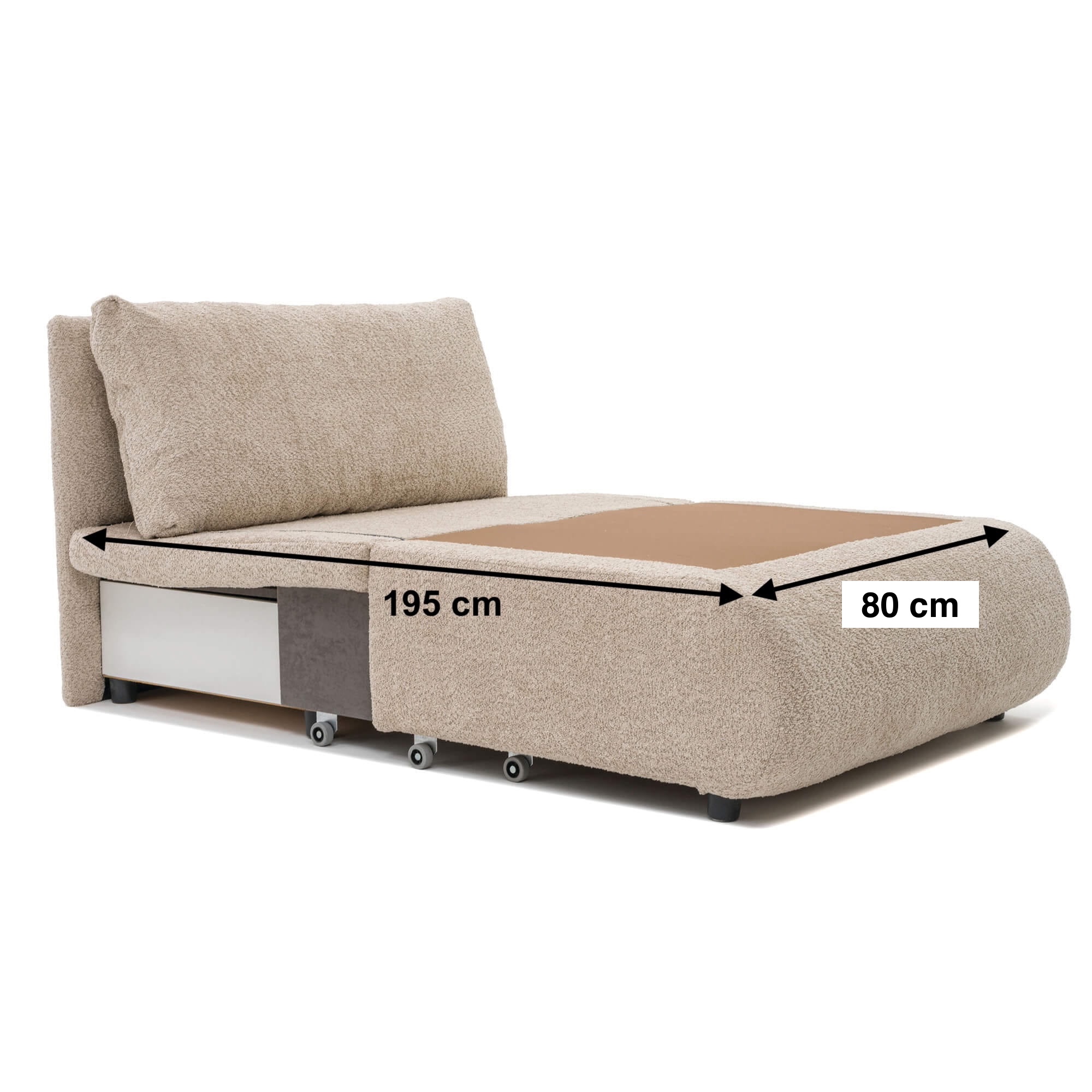 Sofa amerykanka Meg Mini beżowa tkanina boucle jednoosobowa z funkcją spania oraz pojemnikiem na pościel
