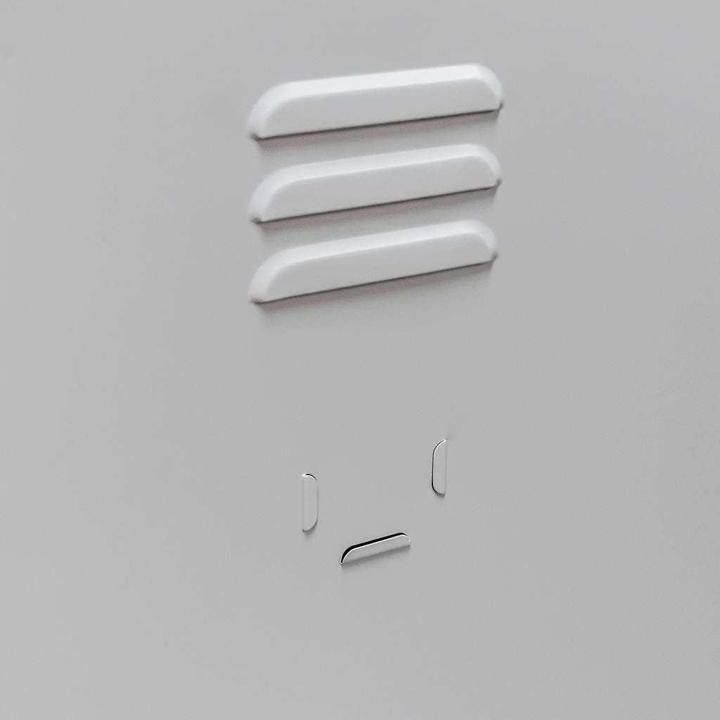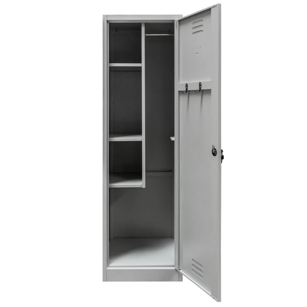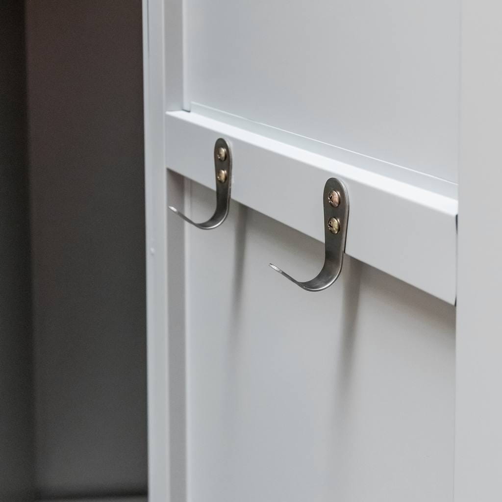 Korpus wykonano z blachy stalowej o grubości 0,6 mm i pokryto trwałą farbą proszkową, co zapewnia odporność na korozję oraz intensywną eksploatację. Wewnątrz znajdziesz trzy praktyczne półki, wysoką komorę ubraniową z drążkiem oraz dodatkowymi haczykami, a także dolną półkę na całą szerokość, która świetnie sprawdzi się do przechowywania obuwia roboczego. Na drzwiach umieszczono funkcjonalne haczyki, a skrzelowe otwory wentylacyjne gwarantują odpowiednią cyrkulację powietrza.