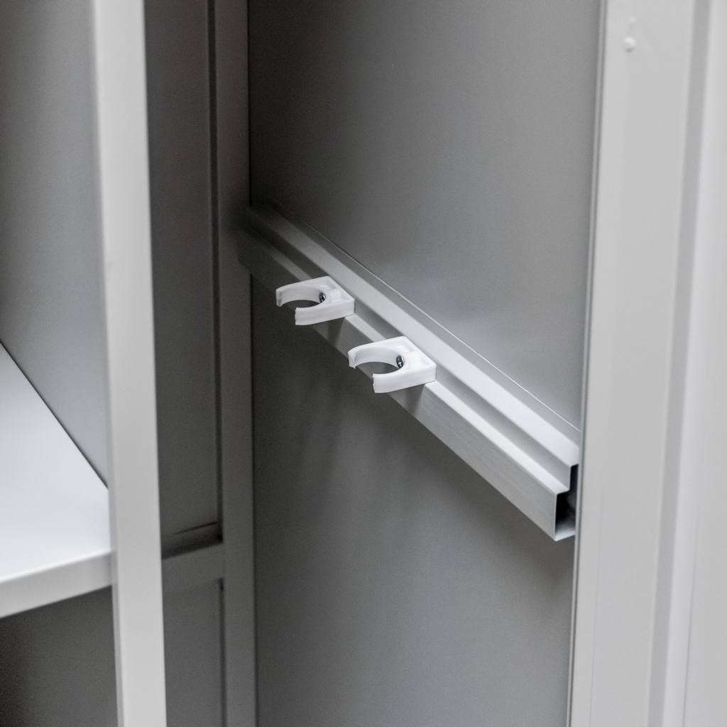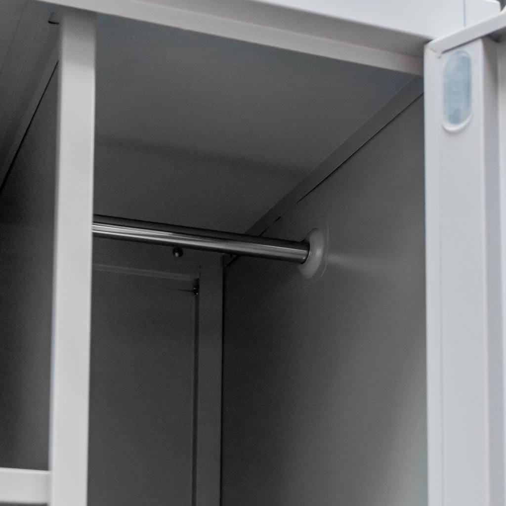 Wysoka komora ubraniowa z drążkiem i haczykami na kurtki, bluzy i odzież ochronną.