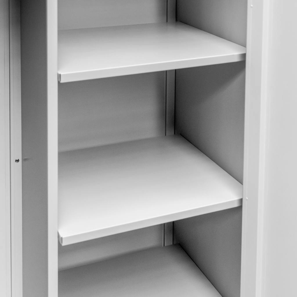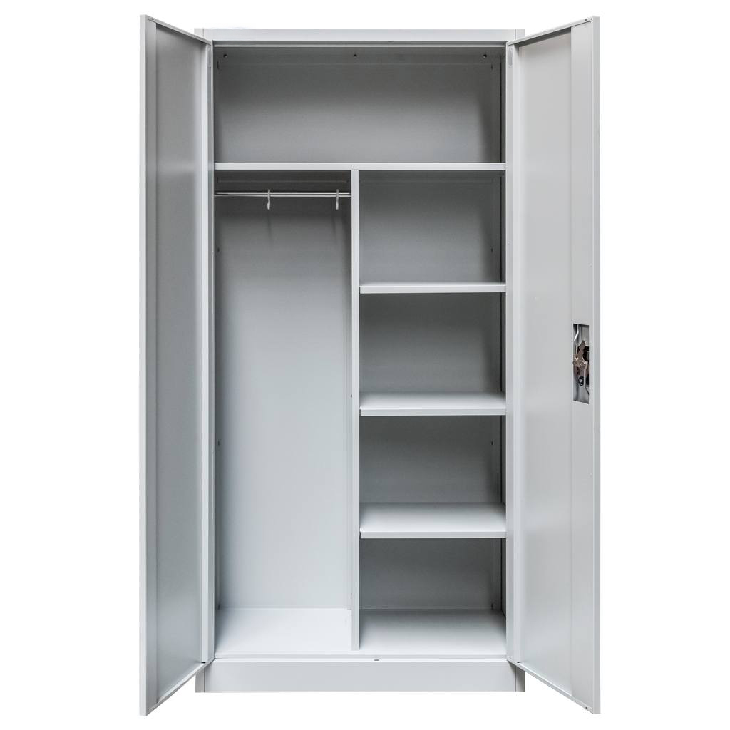 Wnętrze szafy zostało przemyślane tak, aby wygodnie pomieścić zarówno odzież wierzchnią, roboczą, jak i mniejsze przedmioty. Po prawej stronie znajdują się aż cztery funkcjonalne półki, a po lewej — wysoka komora z drążkiem i haczykami, idealna na ubrania wymagające powieszenia. Centralny zamek cylindryczny zapewnia bezpieczeństwo, a w komplecie otrzymasz 2 kluczyki.