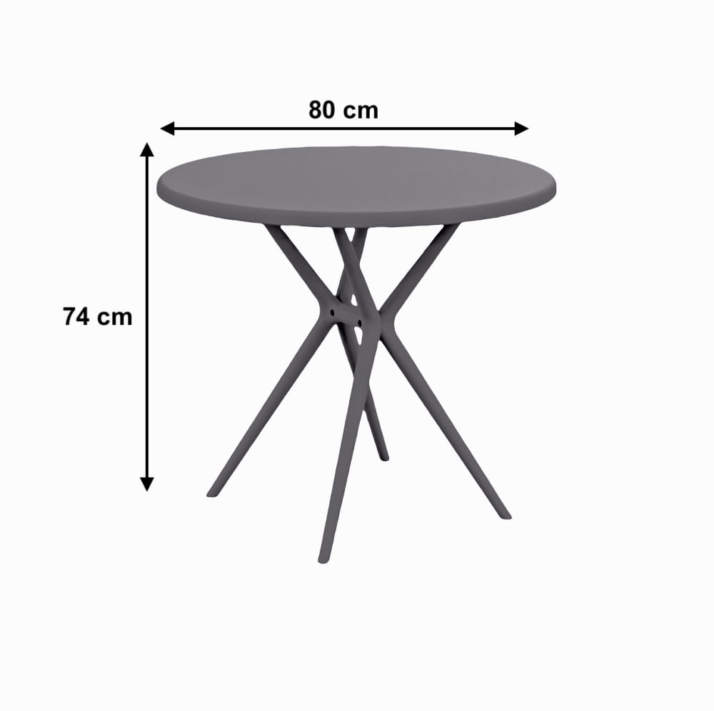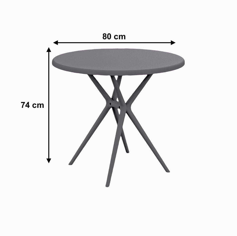 Stolik o średnicy 80 cm to doskonały wybór do małych i średnich przestrzeni. Solidna konstrukcja z tworzywa sztucznego zapewnia wysoką trwałość i odporność na warunki atmosferyczne. Designerskie nogi o dynamicznym kształcie nie tylko dodają elegancji, ale również zapewniają stabilność. Dzięki matowej powierzchni blatu stolik jest odporny na zabrudzenia i łatwy w pielęgnacji.